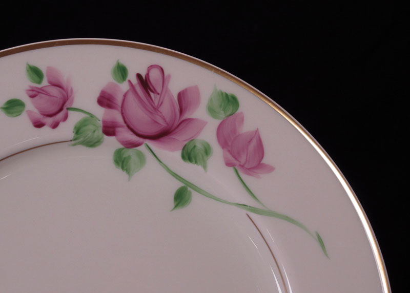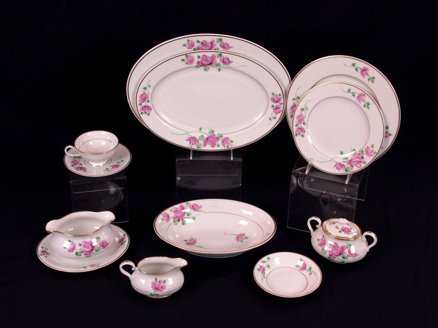 HAND PAINTED CHINA SERVICE BY KIRK: Pattern Kir4. Approx. 79 pieces to include 12 each of dinner plates, salad plates, bread plates, dessert bowls, cups and saucers. Serving pieces are the 2 platters, 2 open vegetable, creamer, sugar, and gravy. Hand painted in a rose design.
