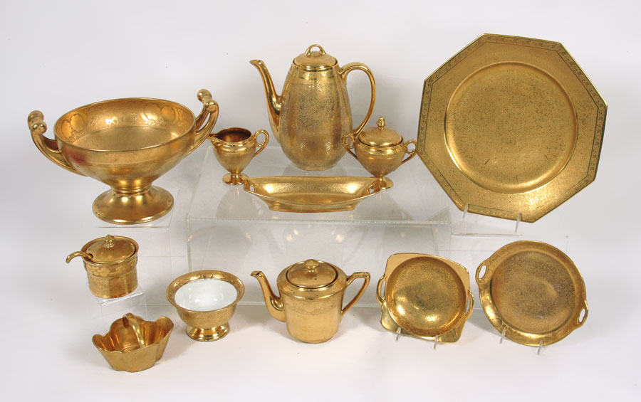 COLLECTION OF BAVARIAN GOLD OVERLAY CHINA: By assorted Bavarian makers, similar but not identical patterns to include 3 cream, 3 sugars, large compote (7 1/2'' x 12 3/4), 2 chargers, large celery, small celery, 2 pair salt & pepper, sauce bowl, coffee pot with lid, 3 small ruffled baskets, tea pot, relish tray, 3 bread & butter plates, nut dish, 3 small trays, ruffled vegetable dish, creamer on saucer.