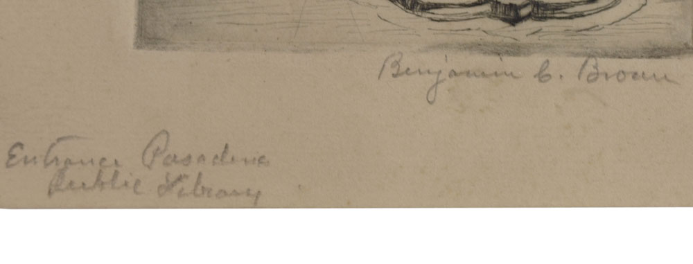 BROWN, Benjamin Chambers, (American, 1865-1942): ''Entrance Pasadena Public Library'', Etching, 5 1/2'' x 4 1/2'' with margins, pencil signed lower right, titled lower left, unframed.