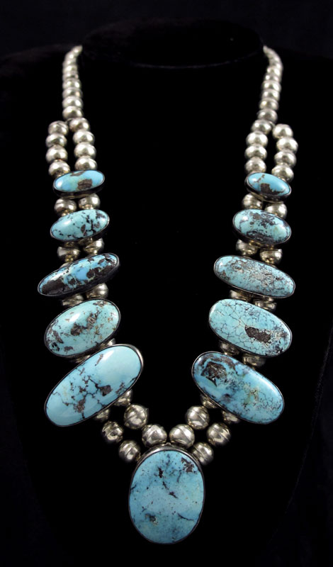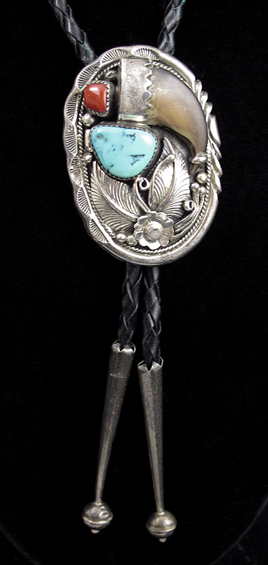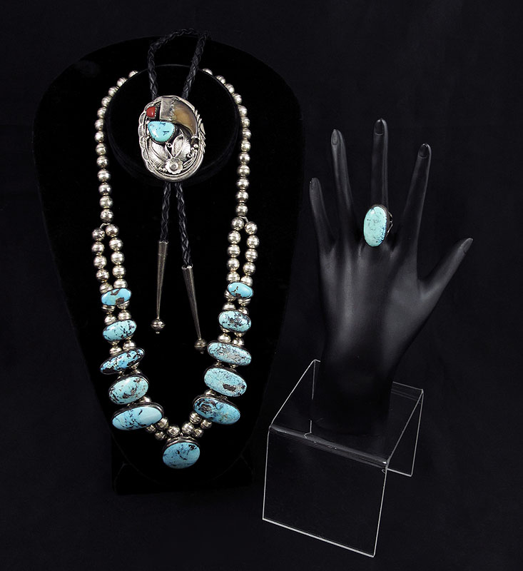 3 PC LOT OF NATIVE AMERICAN SILVER AND TURQUOISE: 1) Bolo tie set with claw, coral and turquoise, marked H Sterling, slide measures 2 1/8'' x 1 3/8'', on braided black leather cord with silver tips; 2) Squash blossom necklace bezel set with lovely sky blue turquoise, no maker mark and unknown silver content, approx. 21''l.; 3) Size 3 1/2 silver ring set with oval cabochon of turquoise. Sold as a lot.