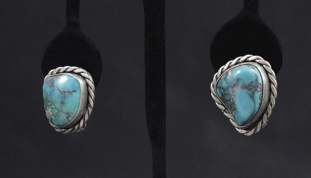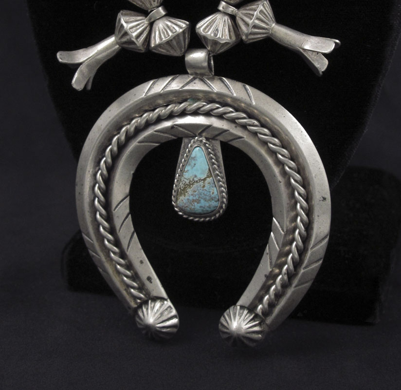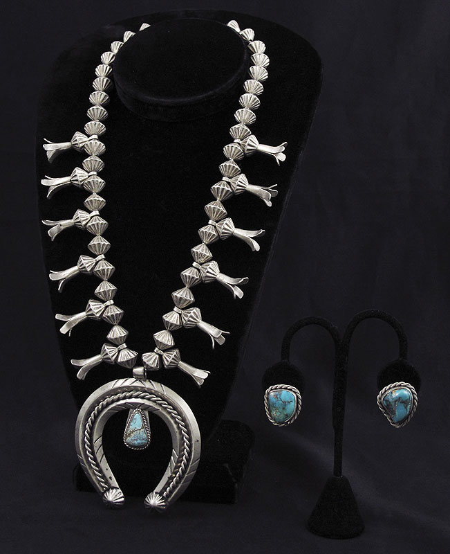 SQUASH BLOSSOM NECKLACE AND TURQUOISE EARRINGS: Traditional squash blossom necklace with 12 blossoms and a 3'' x 2 3/4'' naja set with a single turquoise tear drop, unmarked as to maker. Sold with a pair of sterling clip earrings set with turquoise.