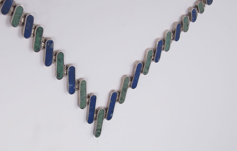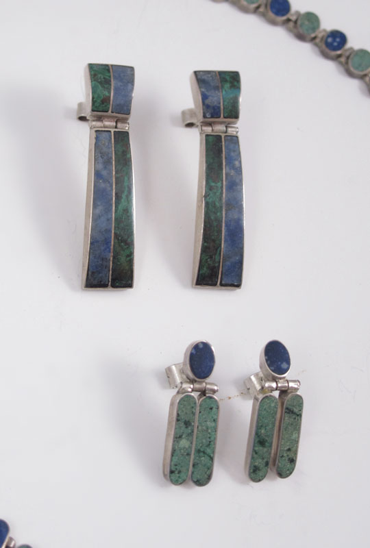 CHILEAN LAPIS & MALACHITE NECKLACE ENSEMBLE: Alternating links of Lapis Lazuli and Malachite set in silver, hinged links, pressure clasp with safety latch marked 950, approx. 18''l., 1.14 troy oz. Sold with two sets of post back dangle earrings, 1''l. set that match the link shape of necklace and 1 5/8''l. block style but set with same stones. With original presentation box marked Faba, gold foil label within ''Artesania Fina Chile Zipico Santiago Chile''.