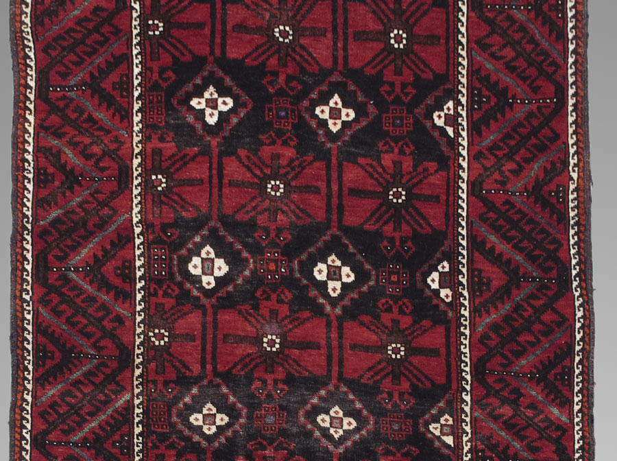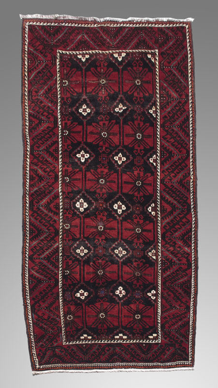 MODERN AFGHAN TURKOMAN DESIGN HAND KNOTTED WOOL RUG, 4' 4'' x 8' 4'': This tribal design rug uses a palette of red-orange, black, some blue and the color white is included sparingly. The white, used only in the centers of the repeating geometric floral motifs and as narrow framing bands of the border, gives emphasis and structure to the rug and make it ''pop''. Condition is very good.
