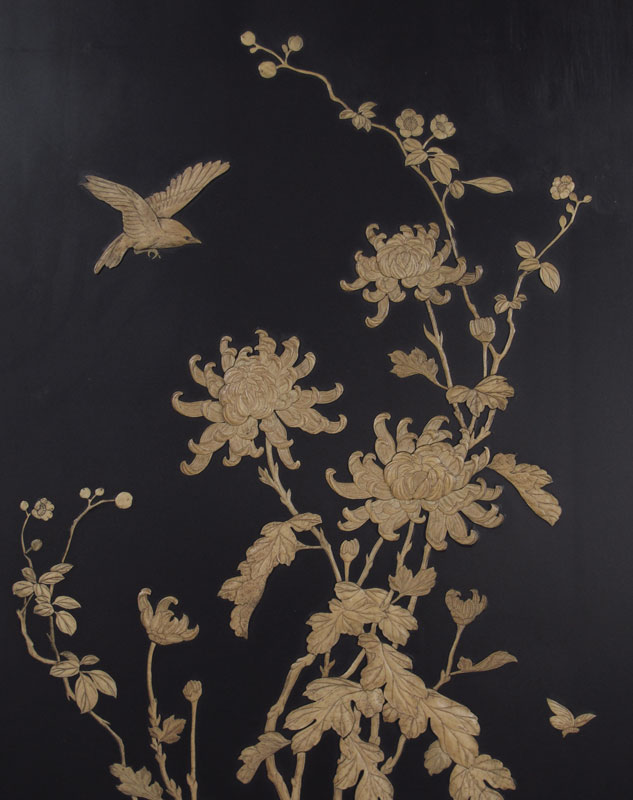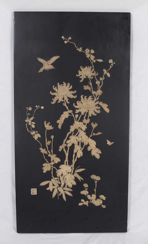 CHINESE WALL PLAQUE: 20th C. in the manner of 19th C. Japanese. Applied bone on wood panel, autumnal bird and flower design. Approx. 42'' x 21.5''.