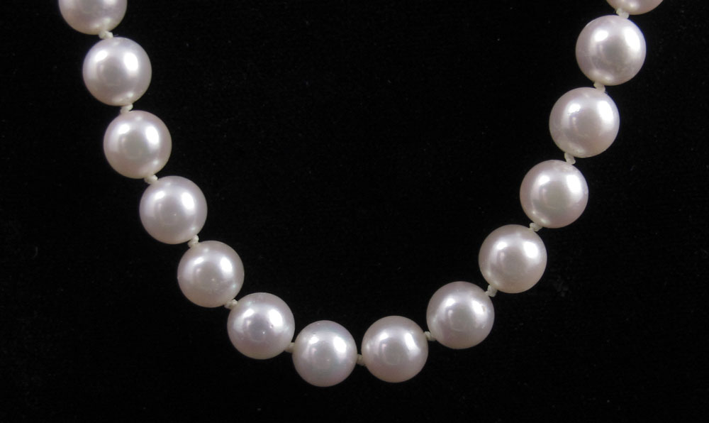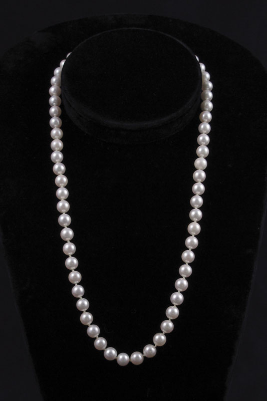 18'' STRAND OF 6.8MM CULTURED PEARL NECKLACE: Double knotted, 14k gold clasp, some loss of nacre.