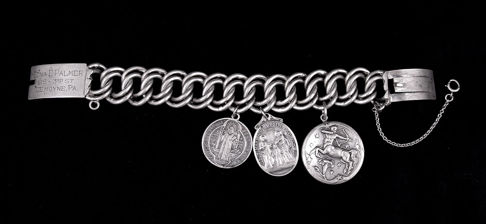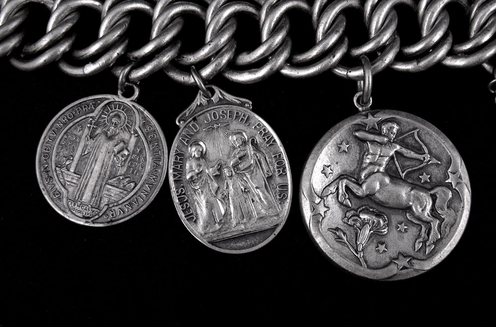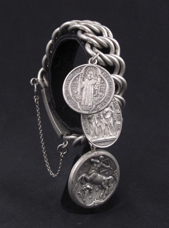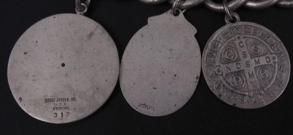 GEORG JENSEN, INC STERLING SAGITTARIUS CHARM: #312, 1 1/4'' dia. Currently attached and sold with a Mexican silver link bracelet and two sterling religious charms.