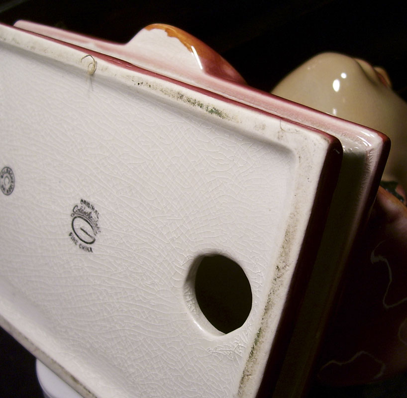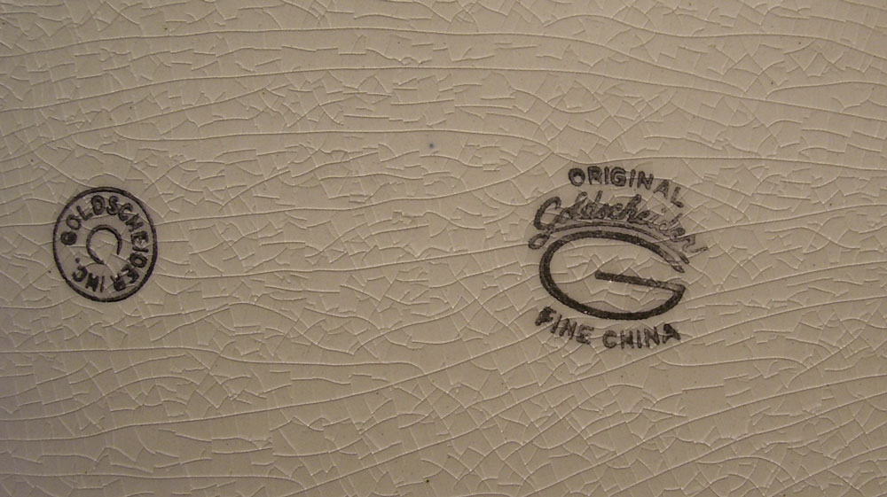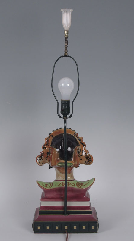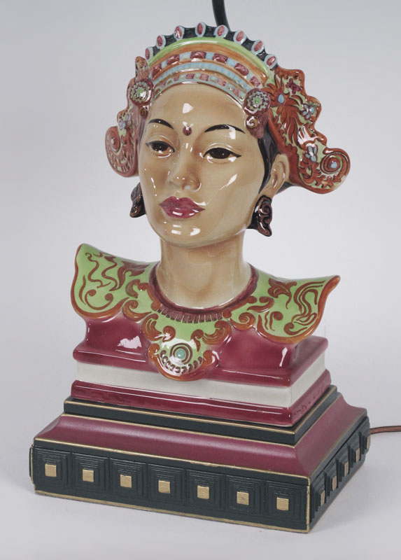 GOLDSCHEIDER SIAM PRINCESS LAMP: Marked Goldsheider under felt base. Porcelain measures 15'' h. x 9 3/4'' x 7'', lamp overall 30 1/2'' h. to top of finial. Sold with modern shade, 10 1/4'' h. x 14 1/2''.