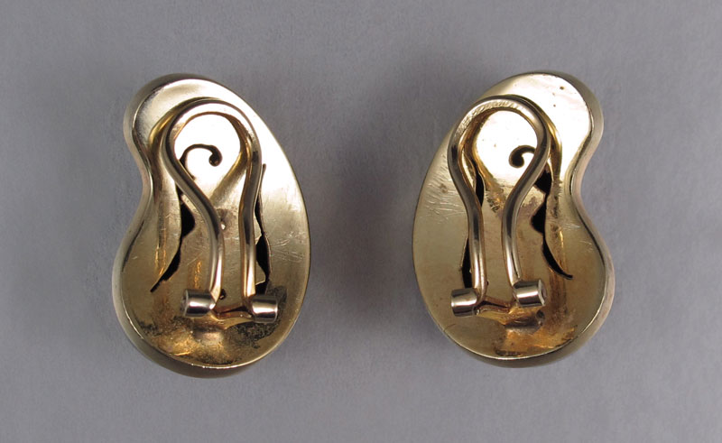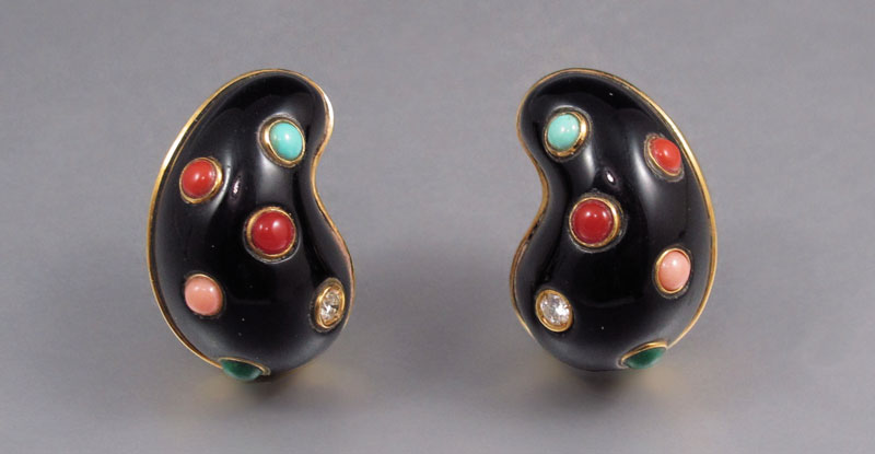 14K ENAMEL & GEMSTONE EARRINGS: 14K black enamel earrings with two round full cut diamonds. Weight: .20 Ct. Approx. Rated VS in clarity and H in color. Ten 3.00 mm cabochon cut pieces of turquoise, coral and malachite. All gemstones are bezel set. Kidney shaped with hinged clip closures. Length 1''. Weight: 22.0 grams.