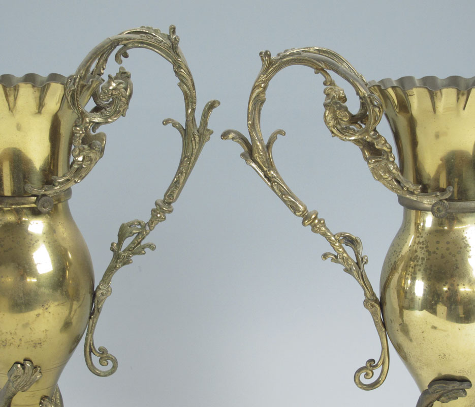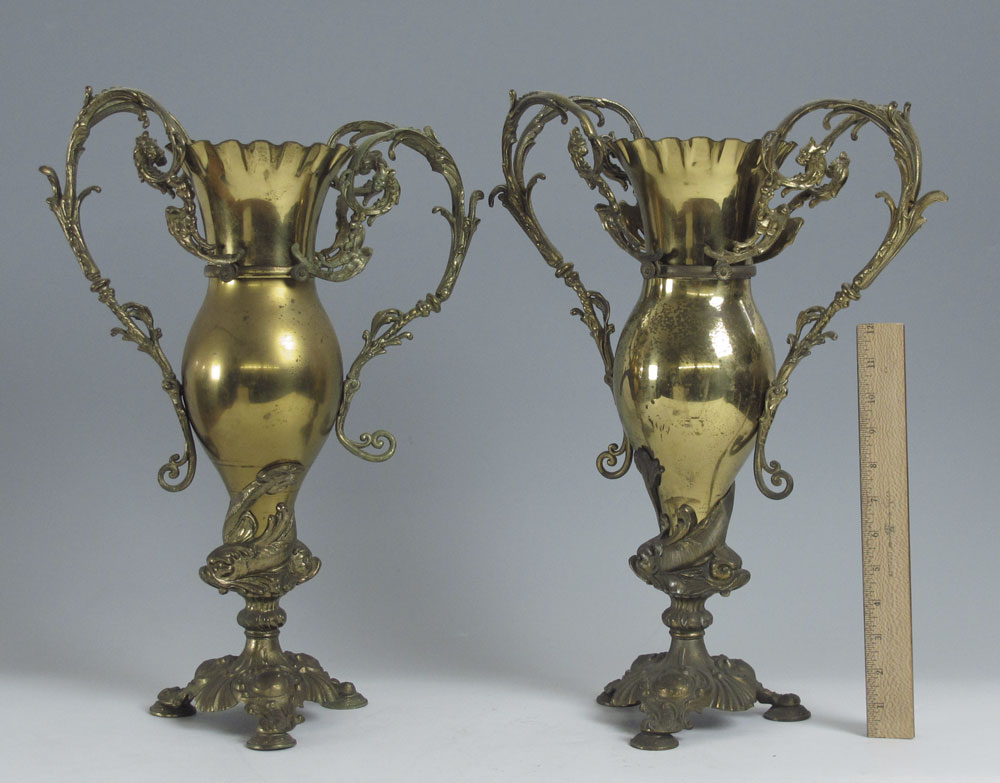 PAIR BRADLEY & HUBBARD URNS: Ornate metal urns, dolphin supports, scroll handel. Approx. 18'' tall, 14 1/2'' at the widest.