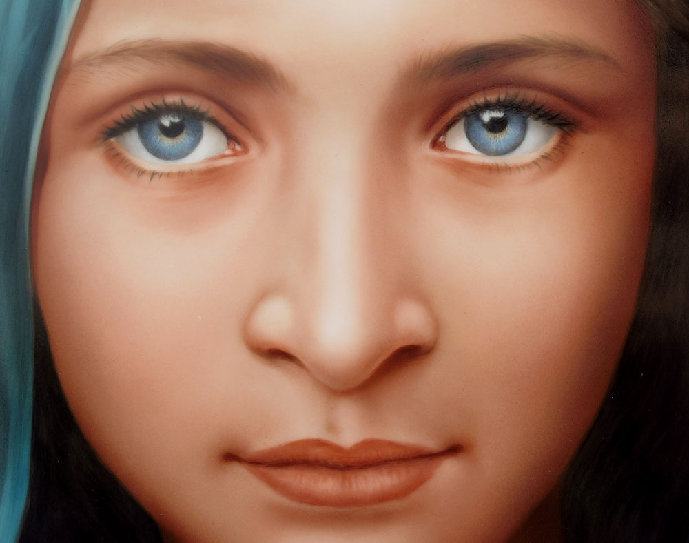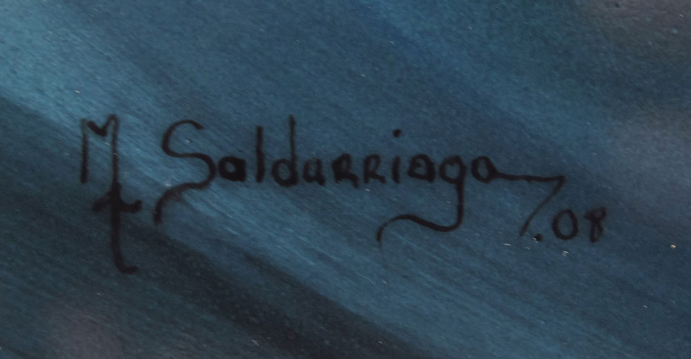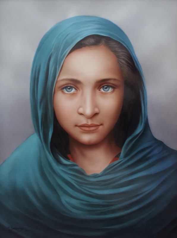 SALDARRIAGA, Maria, (American 20th C): Painting of a Young Blue Eyed Beauty in a Green Hooded Robe, Painting on Porcelain, sight size 15 3/4'' x 11 3/4'', signed lower left, dated '08, framed, 21'' x 17''.