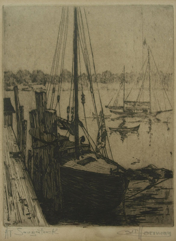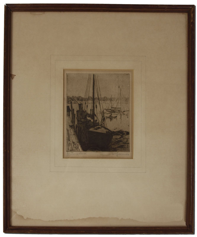 HOERMAN, Carl, (American, 1885-1955): ''At Saugatuck'', dockside scene, Etching, sight size 6 1/2'' x 5 1/4'', pencil signed lower right, titled lower left, framed, 16 3/4'' x 14 3/4''.