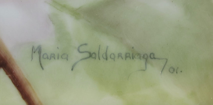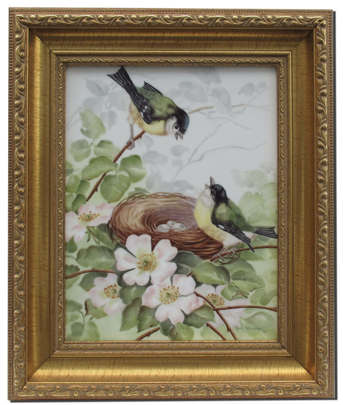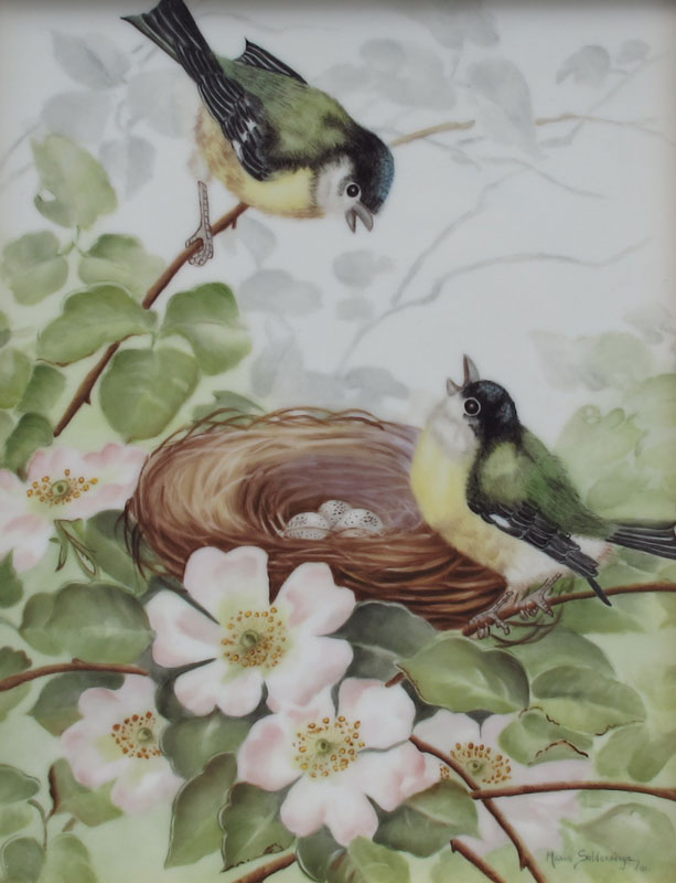 SALDARRIAGA, Maria, (American 20th C): 2 Birds in a Nest with Eggs, Painting on Porcelain, 9 1/4'' x 7 1/2'', signed lower right, dated '01, framed, 14'' x 11 1/2''.