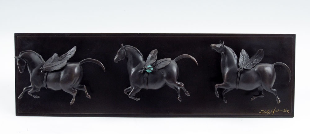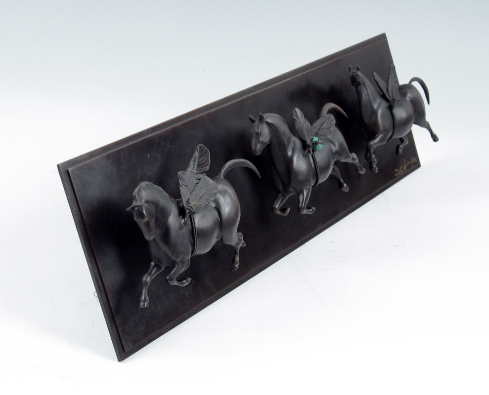 YORK, Star Lianna, (American, 20th Century): ''Horse Flies'', BRONZE RELIEF PLAQUE WITH APPLIED FEATHER WINGED HORSES: 6''h x 20''w, incised signature lower right, numbered 5 / 35.
