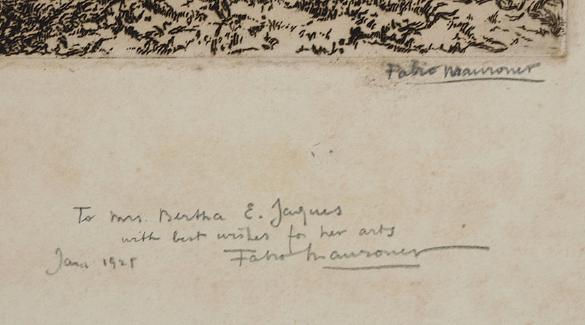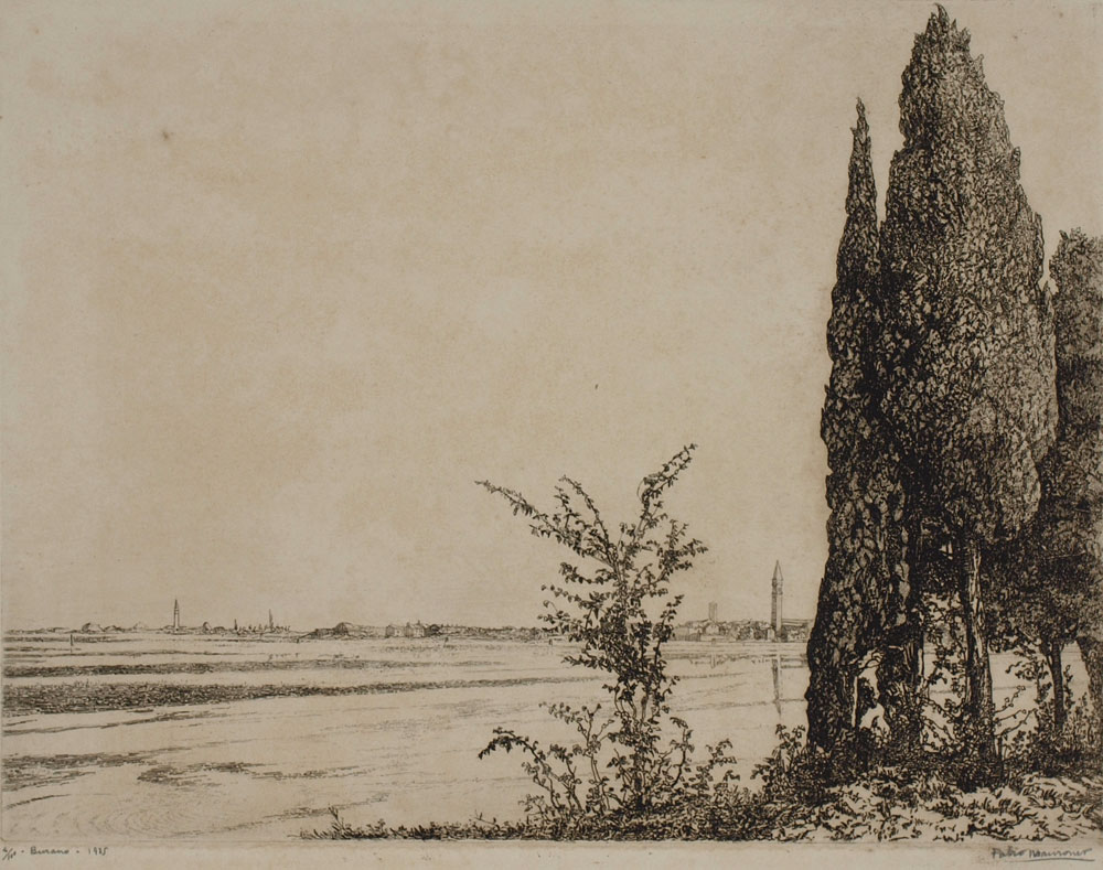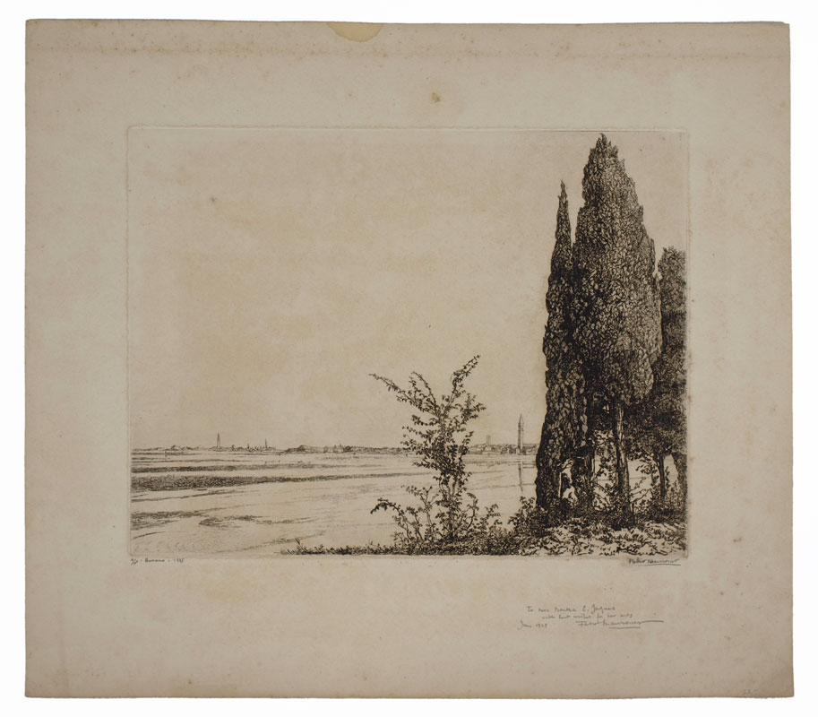 MAURONER, Fabio, (Italian, 1884): ''Burano'', Etching, 14'' x 16 1/4'' with margins, pencil signed lower right, titled lower left, dated 1925 and numbered 4 /100, dedicated to Bertha E Jaques with best wishes for her arts, unframed.