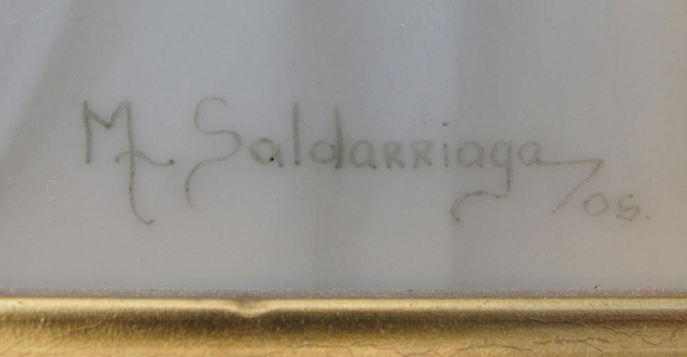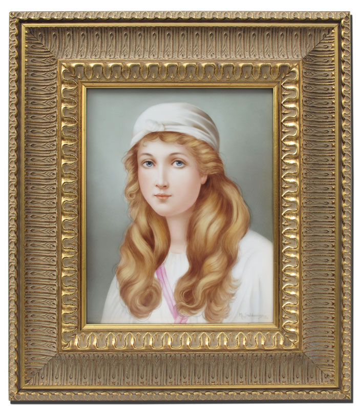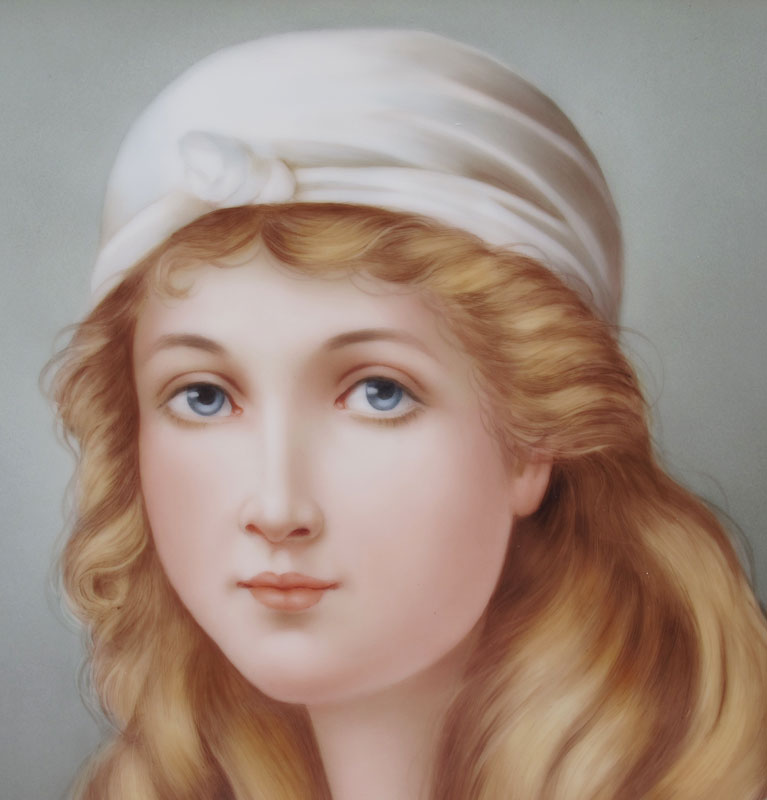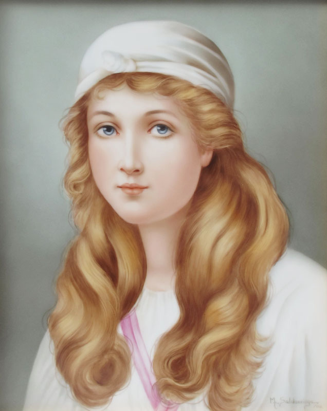 SALDARRIAGA, Maria, (American 20th C): Portrait of a Young Blonde Haired Maiden in White Scarf, Painting on Porcelain, sight size 9 1/2'' x 7 1/2'' signed lower right, dated '06, framed, 16'' x 14''.