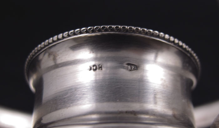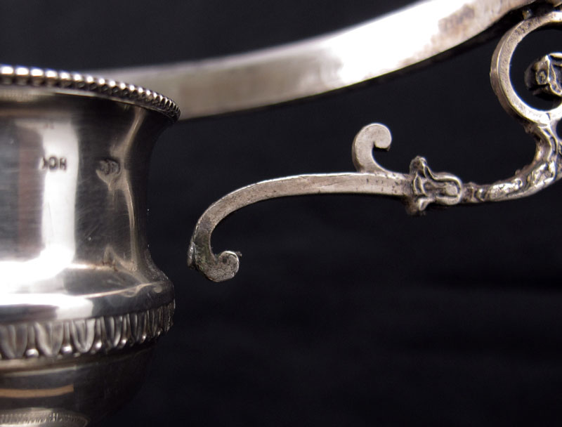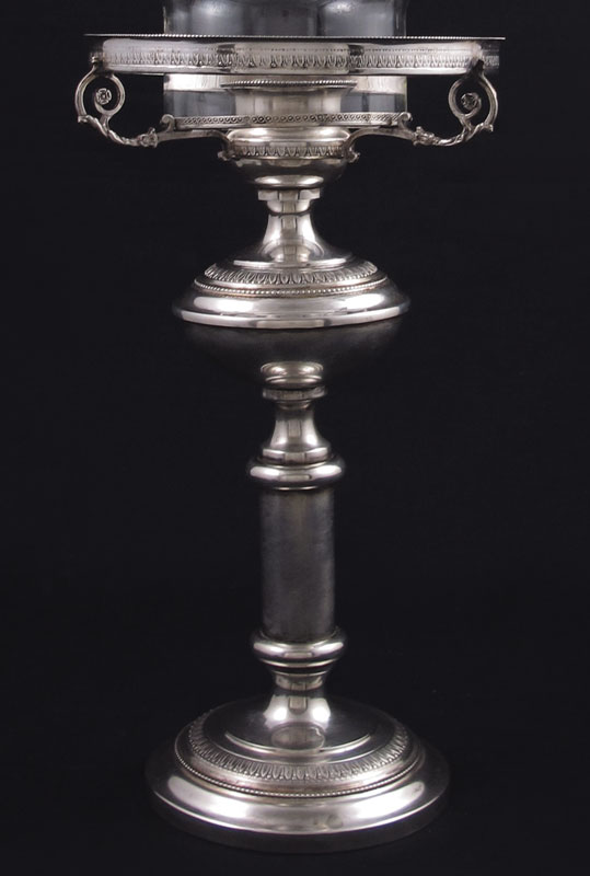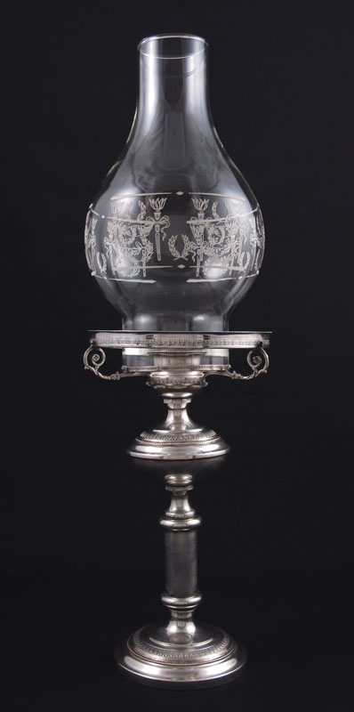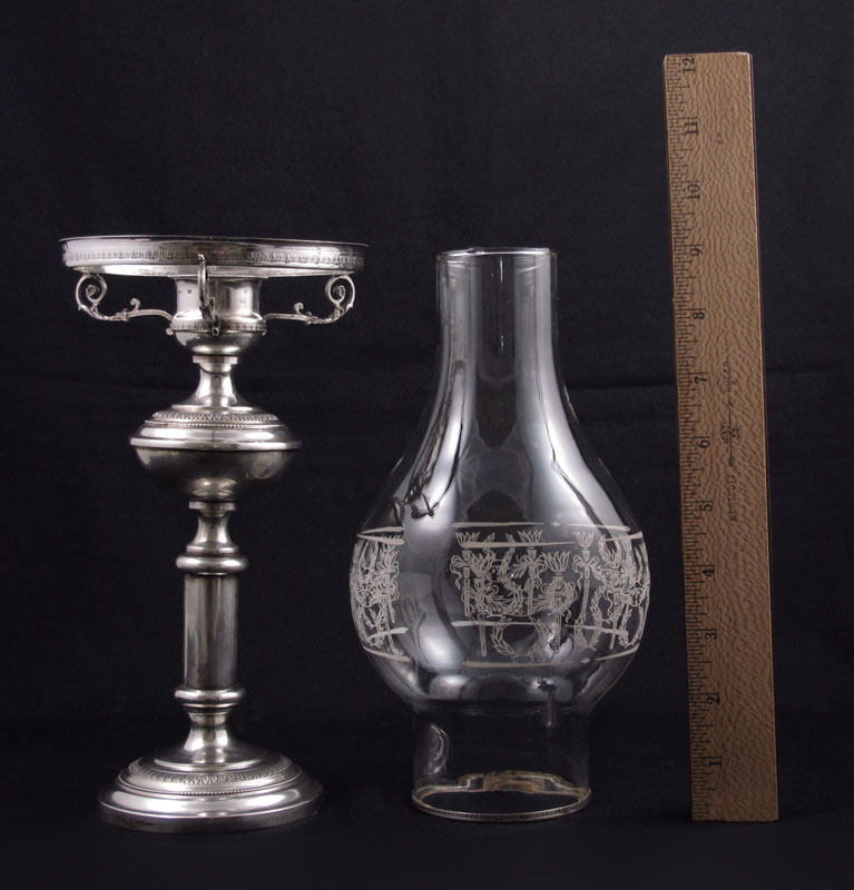 ITALIAN SILVER CANDLE HOLDER & CHIMNEY: 20th century production, Italian and unknown makers hallmarks on body and rim. Sold with cut engraved glass chimney with silver mounted rim. Base 9 3/8'' h. x 5'' dia. Chimney 9'' h. x 5''. Approx. 7.2 troy oz., note weighed with non silver hardware.