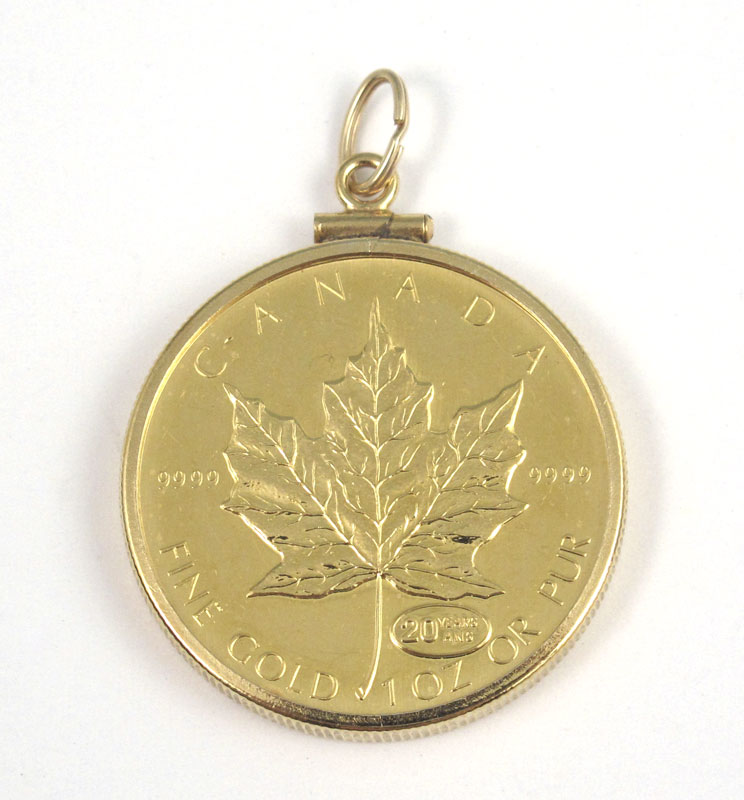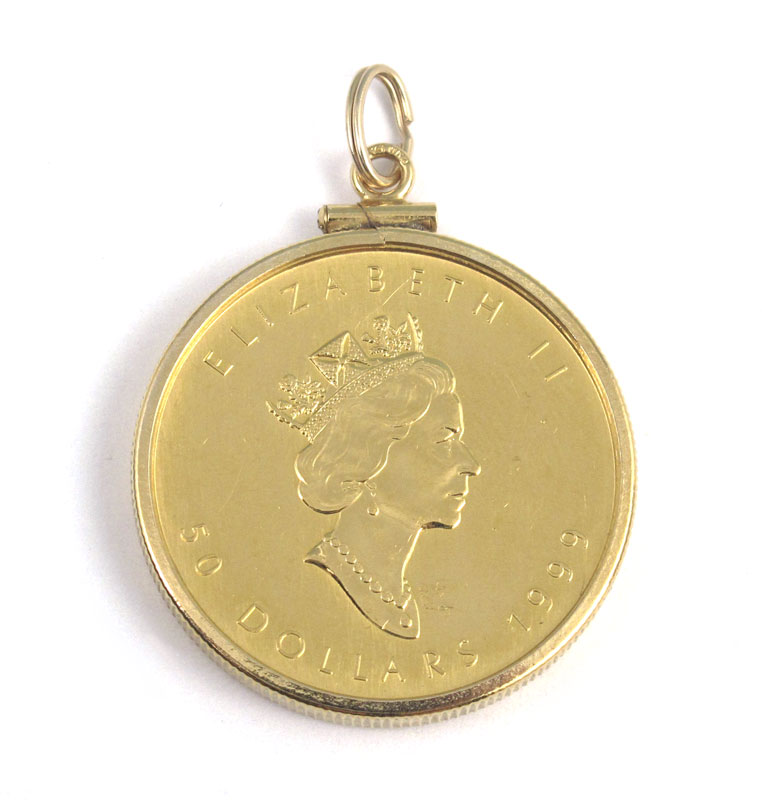 1999 $50 CANADIAN MAPLE LEAF 1 OZ .9999 GOLD COIN: Currently set as pendant in 14k bezel with screw closure. 1.075 troy oz / 33.5 grams inclusive.