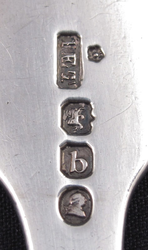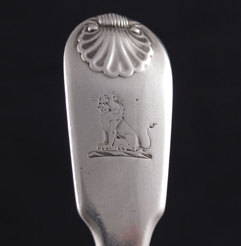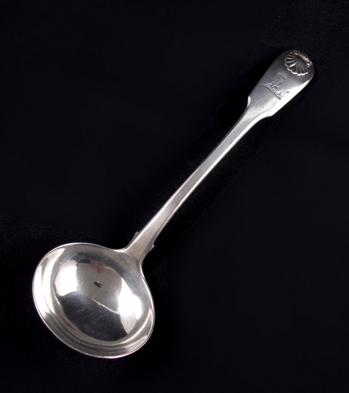 1817 JOHN EDWARD TERRY ENGLISH SILVER LADLE: Shell handle with engraved lion, John Edward Terry and 1817 English silver hallmark. 7 3/8'' l. Approx. 2.6 troy oz.