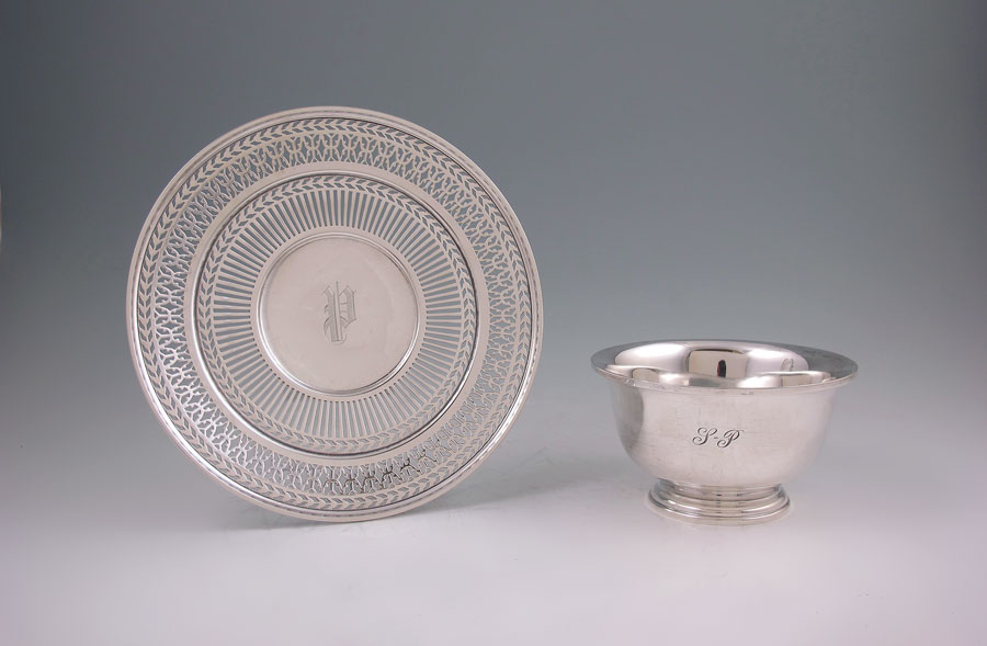RICHARD DIMES FOR CARTIER STERLING BOWL + UNDERPLATE: To include 1) Richard Dimes for Cartier sterling center bowl, monogrammed, 2 5/8'' x 4 3/4''. 2) Watson reticulated underplate, monogrammed. 7 1/2''. Approx. 10.2 troy oz.