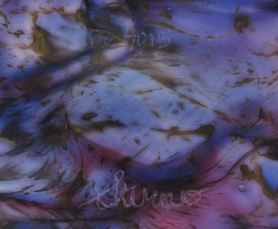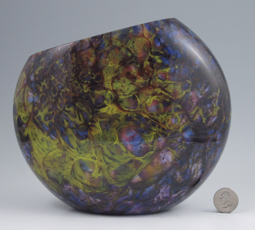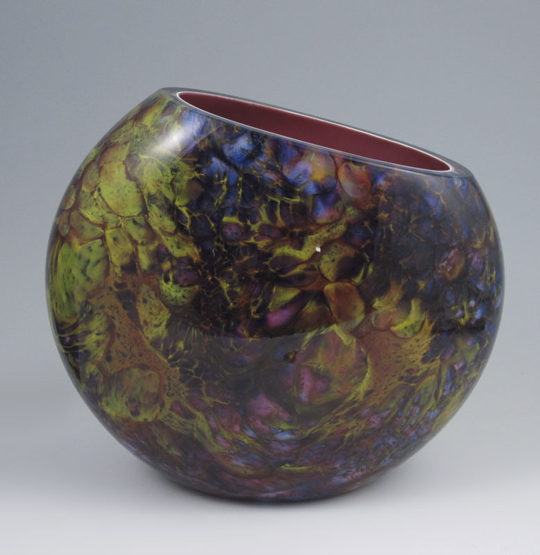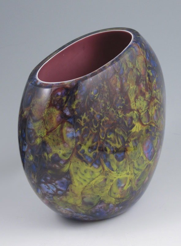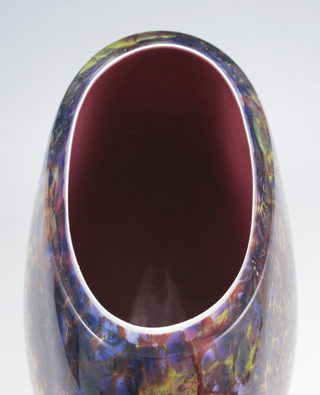 STUDIO ART GLASS VASE: Illegible signature. Thick walled and layered glass vase with off centered opening. 7.5''h. 8'' dia.