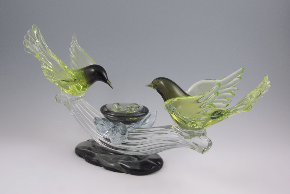 ITALIAN ART GLASS FIGURAL BIRDS: 2 green birds on clear branches with nest in center. Smoky grey base. Unmarked as to maker. 8 3/4'' h. x 17 1/2'' x 3 1/4''.