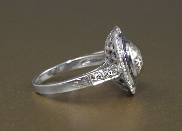 SOPHIA D PLATINUM SAPPHIRE & DIAMOND RING: 1.77ct old Euro cut diamond centers the platinum Sophia D mounting, L-M color SI3-I1 clarity, approx. .65ctw of sapphires and .51ctw brilliant cut diamonds, 8.1 grams, size 6.