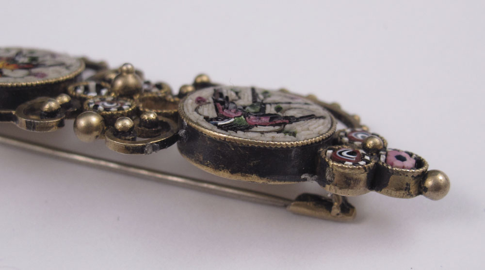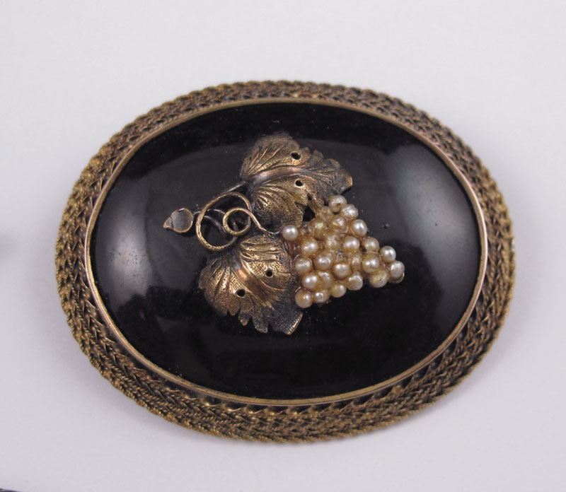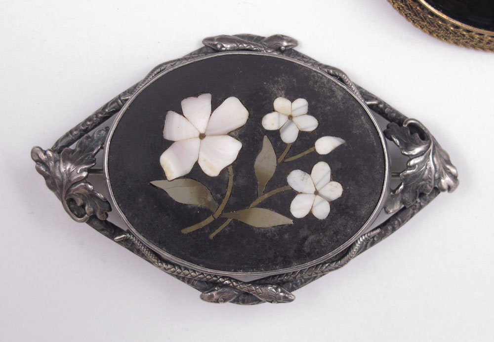 3 PC INTARSIA VICTORIAN BROOCHES: 1) Gold filled brooch with micro-mosaic in a bird pattern. Missing one section of beaded trim and some of the mosaic work. 2 11/16'' x 1'' 2) Gold filled onyx brooch with applied seed pearl grapes, 1 11/16'' x 1 1/4'' 3) Sterling brooch with crossed snakes top and bottom, center oval inlaid in a floral motif, unknown material, 2 5/8'' x 1 5/8''. Sold as a lot.