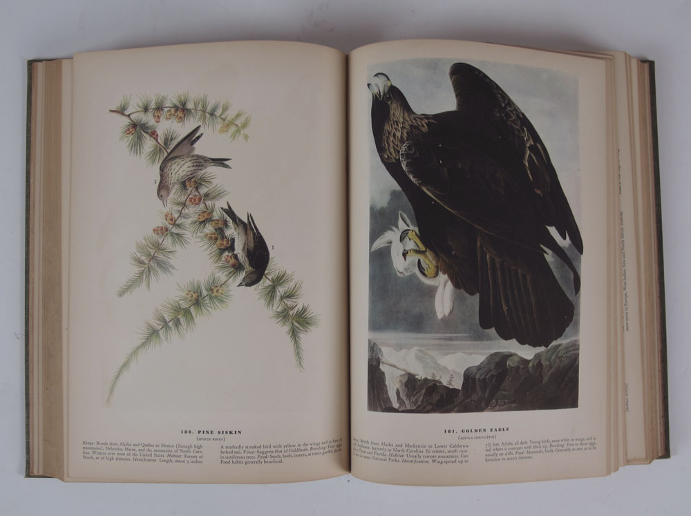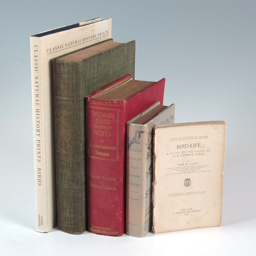 COLLECTION OF 6 VINTAGE BIRD BOOKS AUDUBON & MORE: To include 1) 1937 edition of Audubon's ''The Birds of America'', published by The Macmillan Company. No dust jacket. 2 1/4'' x 12 3/4'' x 9 3/8''. 2) 1910 ''Britians Birds and Their Nest'', by A. Landsborough Thomson with 132 drawings by George Rankin, published by W. & R. Chambers Limited. 2 3/4'' x 10 1/4'' x 7 3/4''. 3) 1990 ''Classic Natural History Prints: Birds'' by S. Peter Dance, published Studio Editions, London. Dust jacket present, 1'' x 14 1/4'' x 10 1/4''. 4) 1958 ''The Audubon Book of True Nature'' edited by John K. Terres. 1 1/2'' x 8 1/2'' x 5 7/8''. 5) 1904 Unbound ''Bird - Life'' by Frank M. Chapman, published D. Appleton and Company. 6) 1988 World of Birds by James Fisher and Roger Tory Peterson, published by Cresent Books. Dust jacket present.