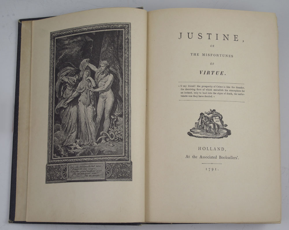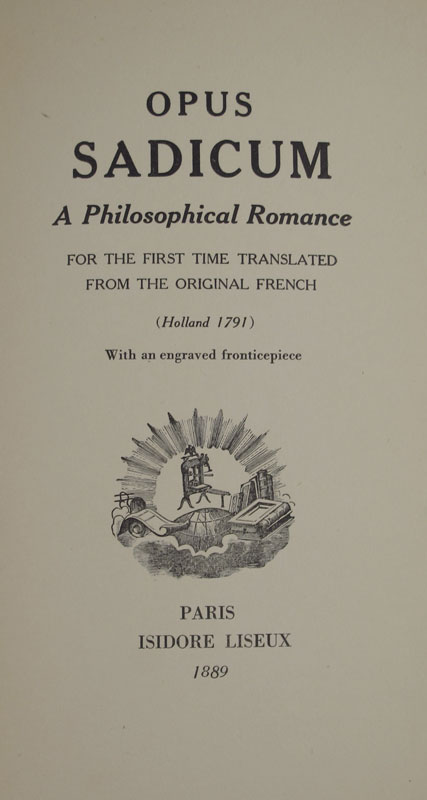 1889 MARQUIS DE SADE OPUS SADICUM BOOK: 1889 first English translation of the 1791 Justine or the Misfortunes of Virtue, alternate title Opus Sadicum a Philisophical Romance, limited edition printing of 250, not numbered as to which number of 250. No dust jacket. 1 3/4'' x 9 1/2'' x 6 3/4''.