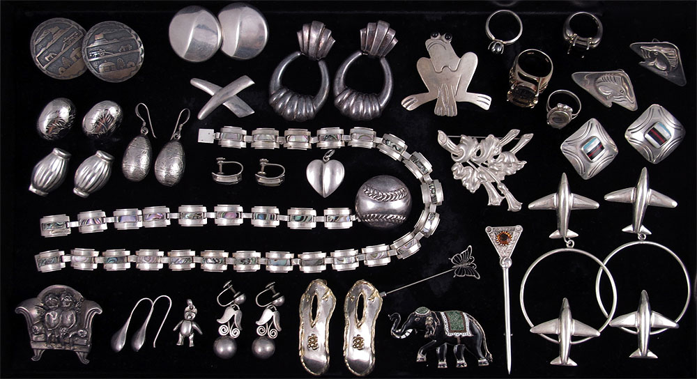 ESTATE LOT OF STERLING JEWELRY: To include, 3 pc ensemble set with mother of pearl, necklace, bracelet and screw back earrings all marked Sterling Taxco 925, earrings and necklace also marked CBL; assorted earrings to include airplane motif; Danecraft flower brooch; Celtic stick pin marked Made in GBritain with Birmingham mark; Siam elephant pin; four rings; plus more. 9.365 troy oz. inclusive of assorted stones, findings and finishes.