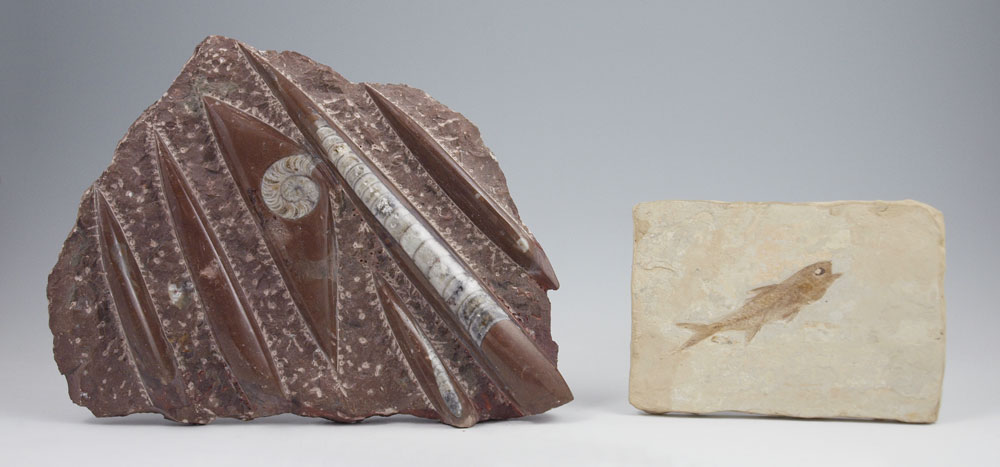 2 PIECE ORTHOCERAS & FISH FOSSIL: To include 1) Brown marble with Orthoceras fossil, Atlas Mountains, Morocco. 7'' x 9 1/2''. 2) Knightia Oecaena fish fossil, Green River Wyoming, 4'' x 5 1/2''.