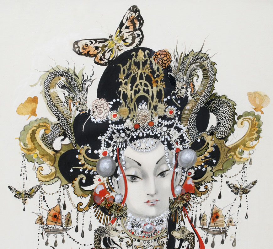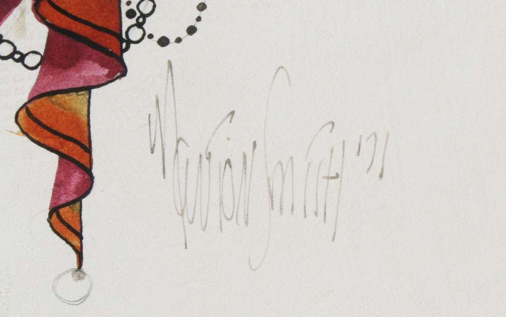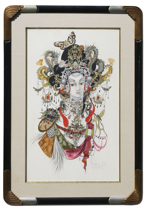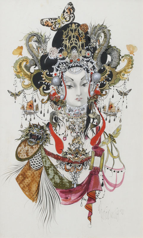JAPANESE MOTIF WATERCOLOR SIGNED NEWTON SMITH : Sight size 27 1/2'' x 16 1/2'', signed lower right, dated 71, depicts a montage of Japanese motifs with dragons, butterflies, junks, and a woman's face, possible illustration for a book cover, custom carved and painted frame with wear, 36'' x 25''.