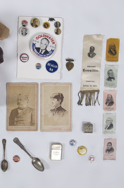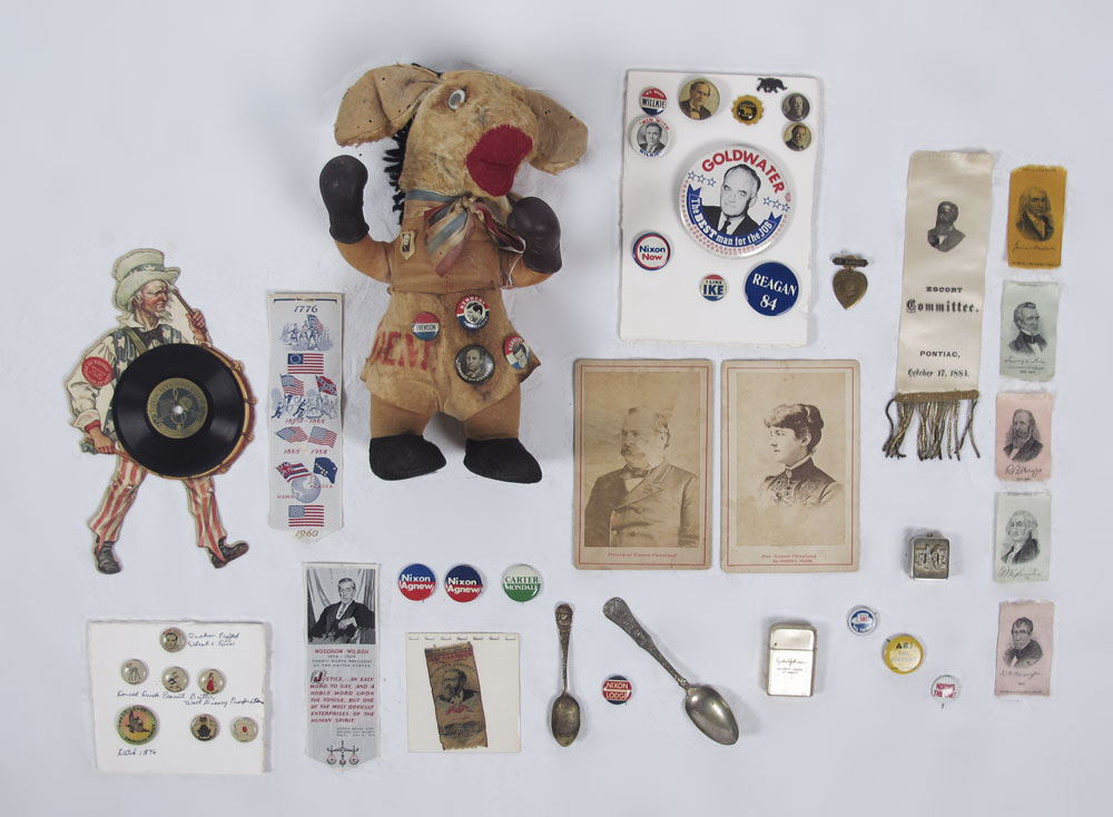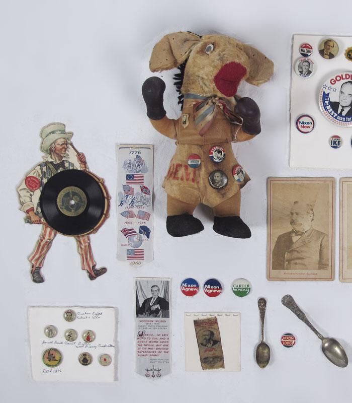 COLLECTION OF POLITICAL BUTTONS & DEMOCRAT DONKEY: To include 1) Gund stuffed Democrat donkey with Kennedy, Roosevelt and Stevenson pins. 2) Collection of Republican pins to include W. J. Bryant, Goldwater, Landon/Knox, Nixon, Ike and Reagan. 2 Grover Cleveland as well. 3) Collection of period ribbons including Benjamin Harrison, James Blaine, also includes reproduction cigarette company ribbons. 4) Unique Uncle Sam figural Talking Book Co. record. 5) Cabinet photo of Mrs. Grover Cleveland. 6) Lyndon Johnson lighter. 7) Ike musical pendant. 8) Pair of World's Fair spoons.