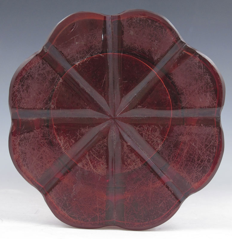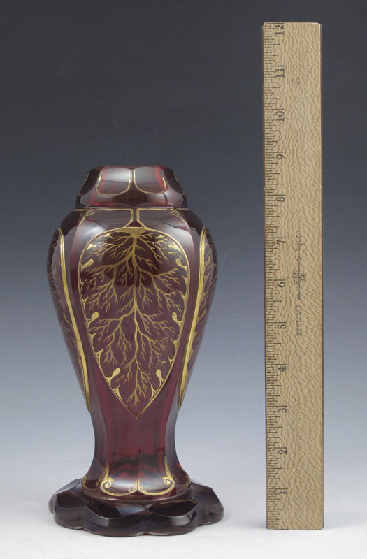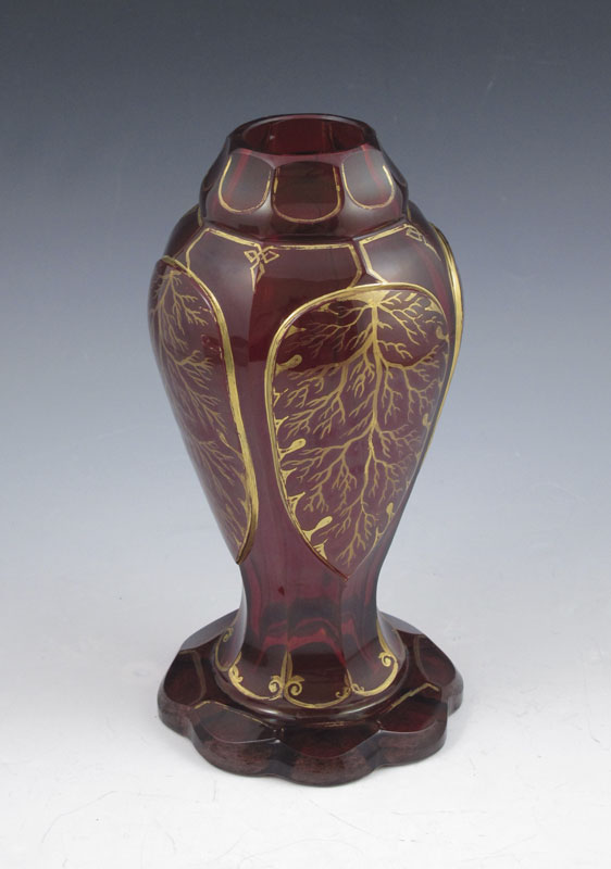 EARLY BOHEMIAN RUBY GLASS VASE: Facet cut, scalloped rim, gilt decor, 9''.