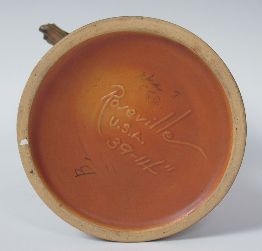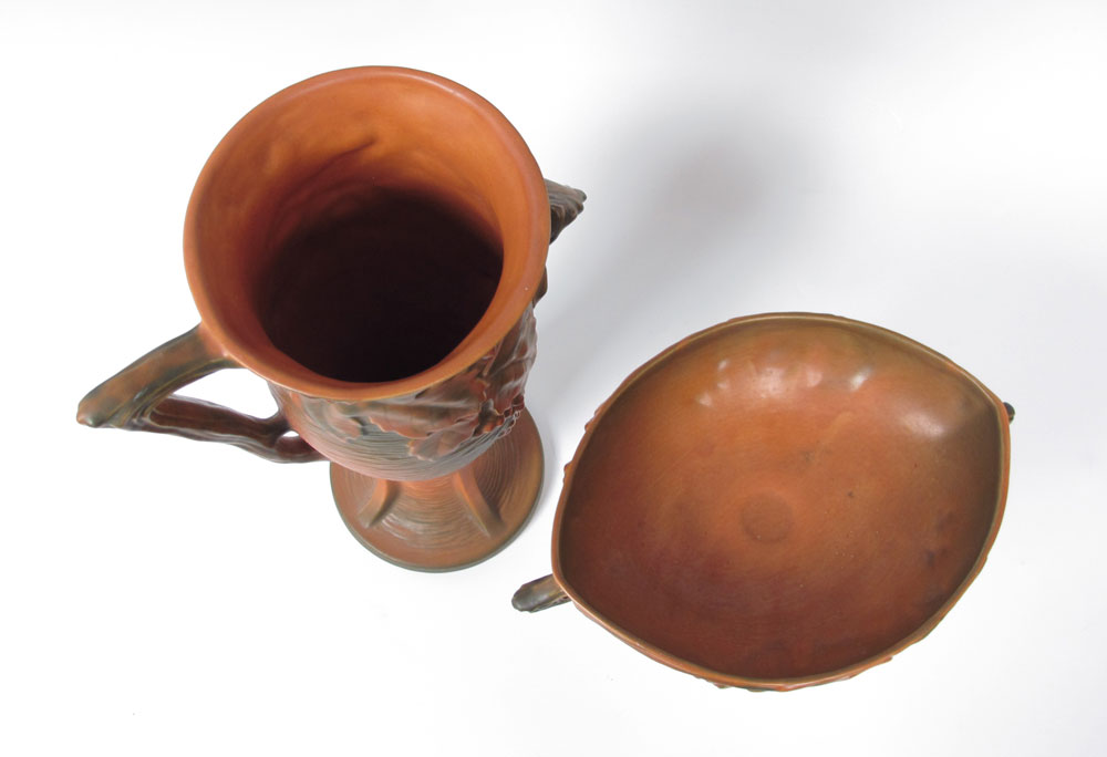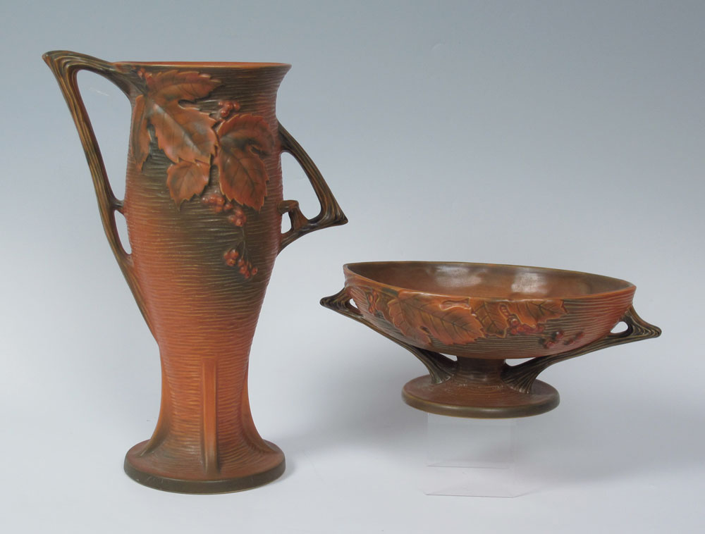 ROSEVILLE BUSHBERRY VASE AND PLANTER: Brown, the 14'' vase is shape. The planter shape 39, 10'' dia.
