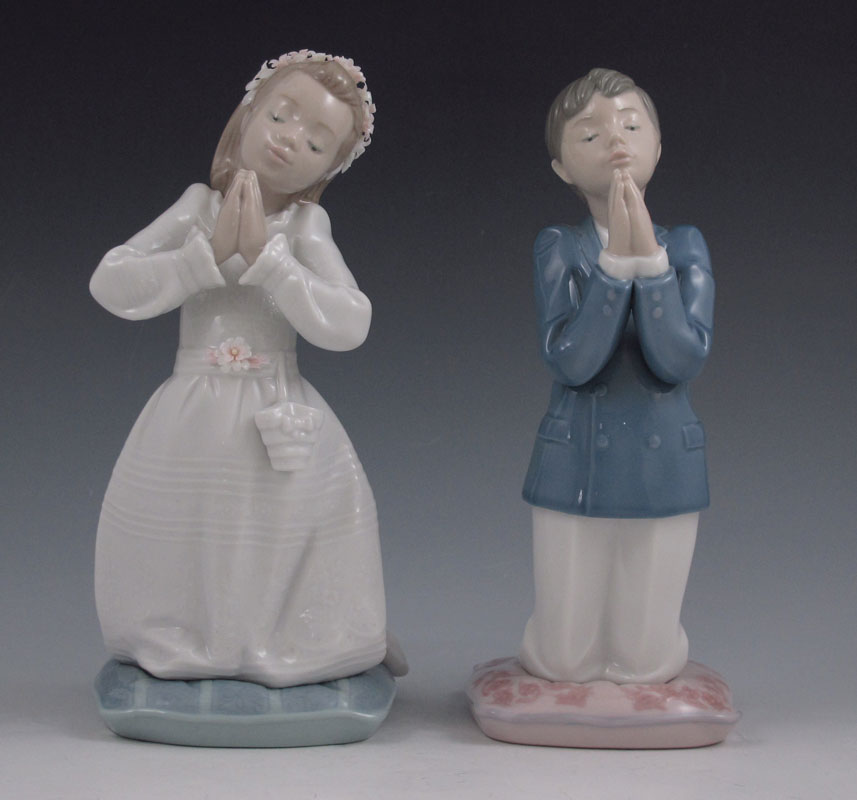 LLADRO COMMUNION PRAYER BOY 6088G AND GIRL 6089G: Joan Coderch, issued 1994, 7 1/2''h. each, both with original boxes.