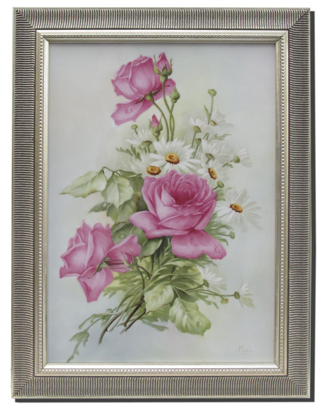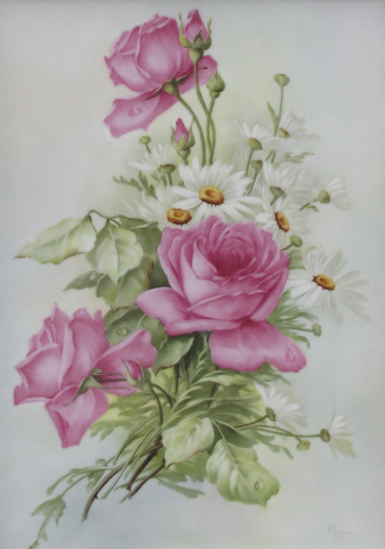 SALDARRIAGA, Maria, (American 20th C): Still Life of Pink Roses and Daisies, Painting on Porcelain, sight size 13 1/2'' x 9 1/2'', signed lower right, framed, 16 1/2'' x 13''.