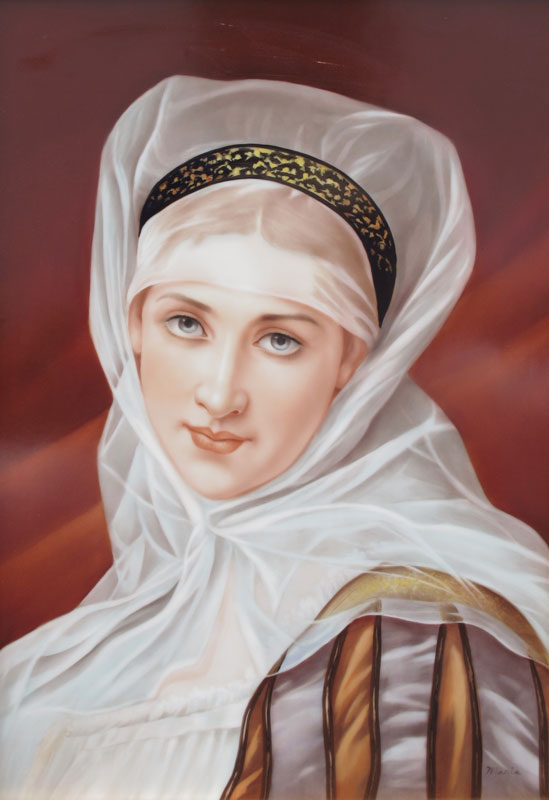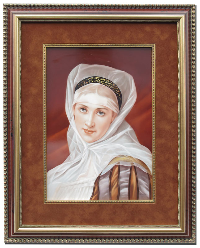 SALDARRIAGA, Maria, (American 20th C): Young Beauty and Hood, Painting on Porcelain, sight size 13'' x 9'', signed lower right, framed, 21'' x 17''.