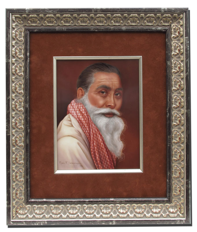 SALDARRIAGA, Maria, (American 20th C): White Bearded Man Possibly Hispanic, Painting on Porcelain, sight size 9 1/2'' x 7 1/4'', signed lower left, dated '03, framed, 18'' x 16''.
