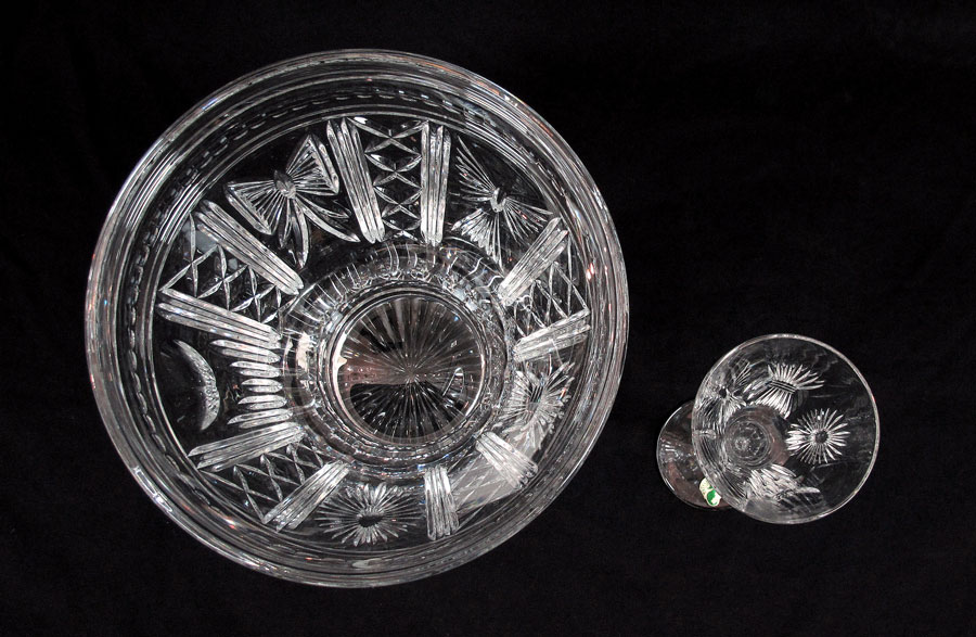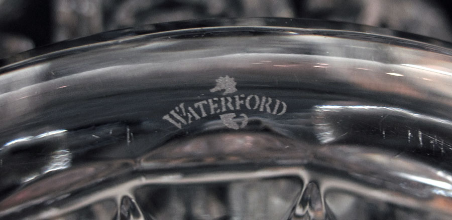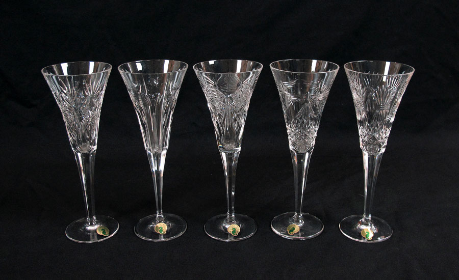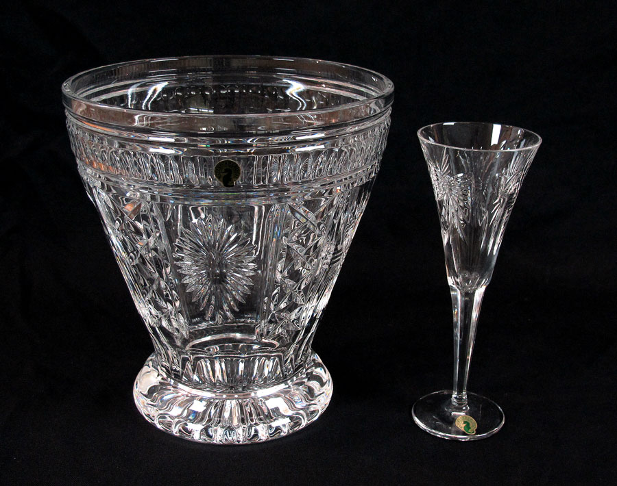 WATERFORD CRYSTAL MILLENNIUM CHAMPAGNE BUCKET AND 12 TOASTING FLUTES: Bucket 10 1/2'' x 9 3/4''. 12 flutes in 6 patterns matching bucket panels, 9 1/4'' h. x 3 1/2'' dia.