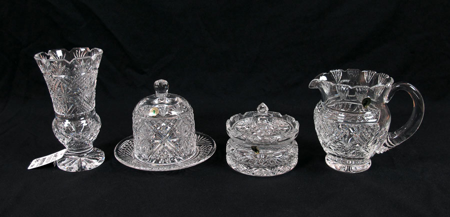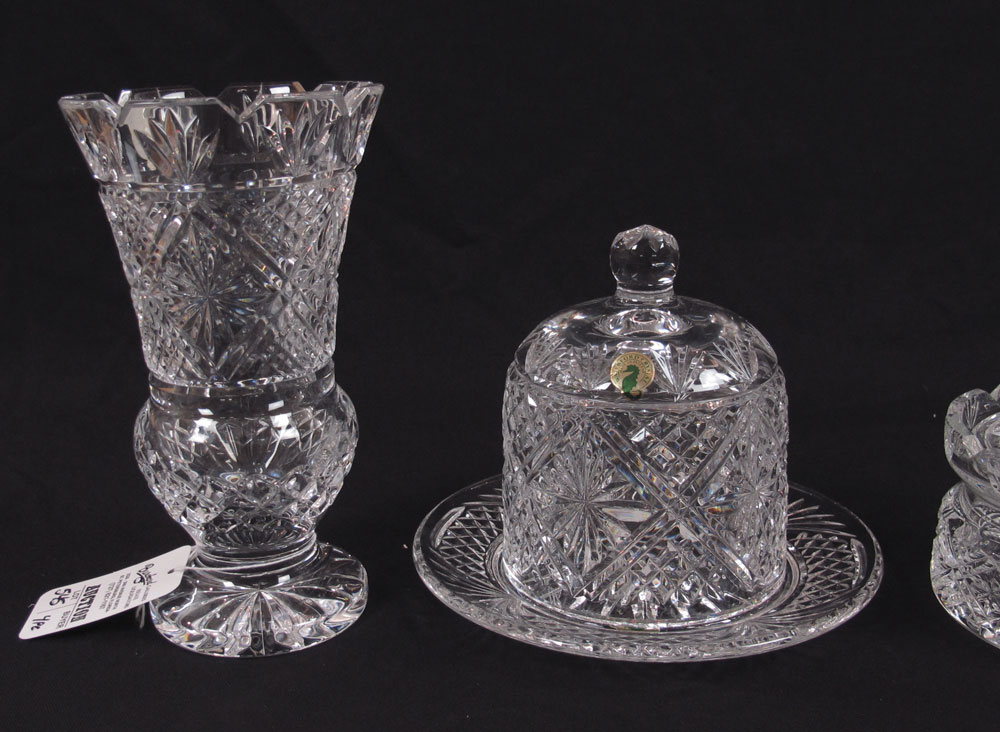 WATERFORD CRYSTAL SAMUEL MILLER: Dessert dome, 6'' tall, Jug, 6'', covered butter, and a vase 8 1/2''.
