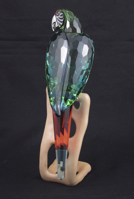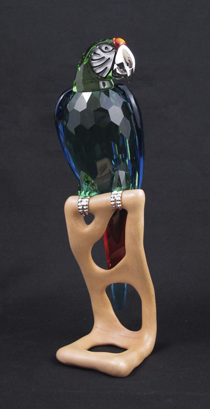 SWAROVSKI CRYSTAL FIGURAL MACAW: Roland Schuster designer, faceted chrome green crystal with other crystal color accents, perched on wooden display, currently available on Swarovski site $950.