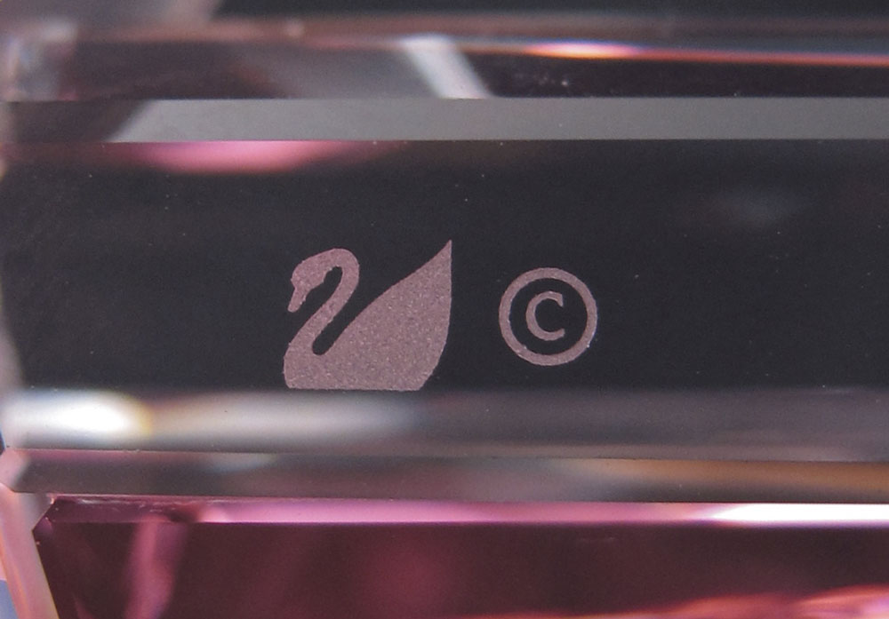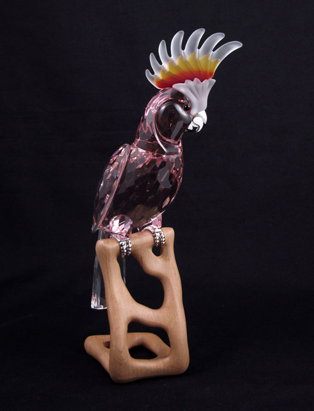 SWAROVSKI CRYSTAL FIGURAL COCKATOO: Roland Schuster designer, faceted rose pink crystal with other crystal color accents, perched on wooden display, retired.