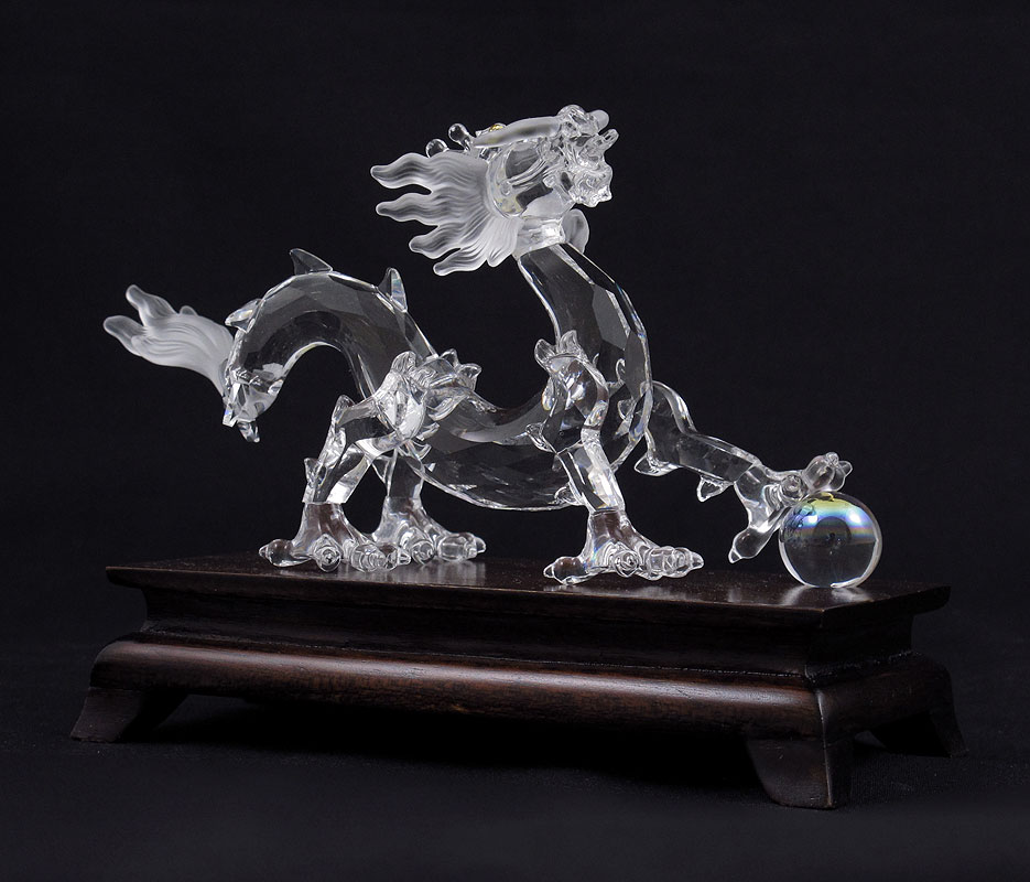SWAROVSKI CRYSTAL FIGURAL DRAGON 7550: G. Stamey designer, issued 1999, with iridescent ball and wooden stand.