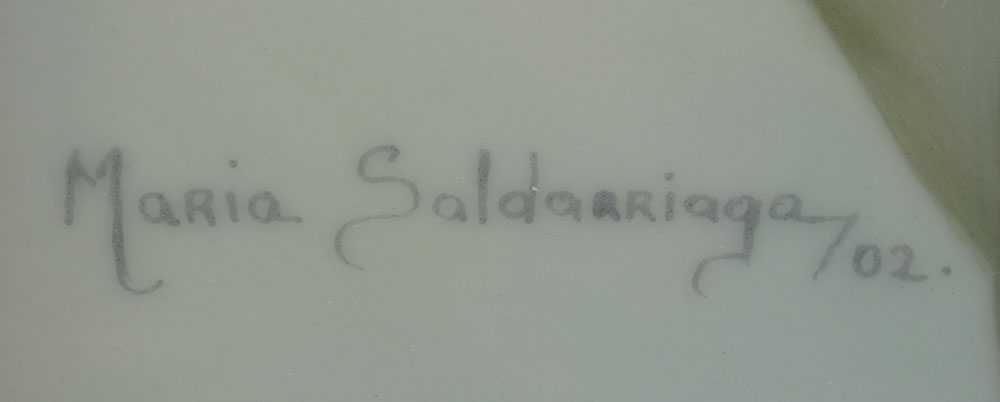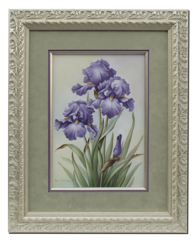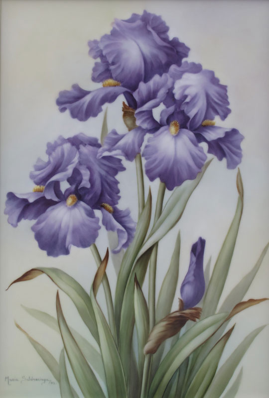 SALDARRIAGA, Maria, (American 20th C): Purple Gladiolas, Painting on Porcelain, sight size 13 1/4'' x 9 1/4'', signed lower left, dated '02, framed, 22'' x 18''.