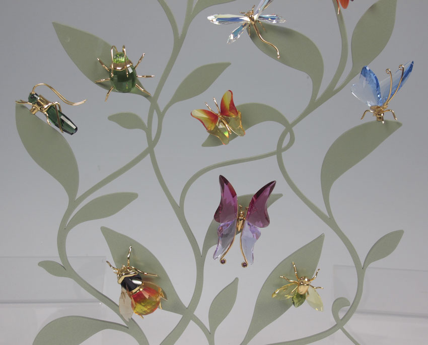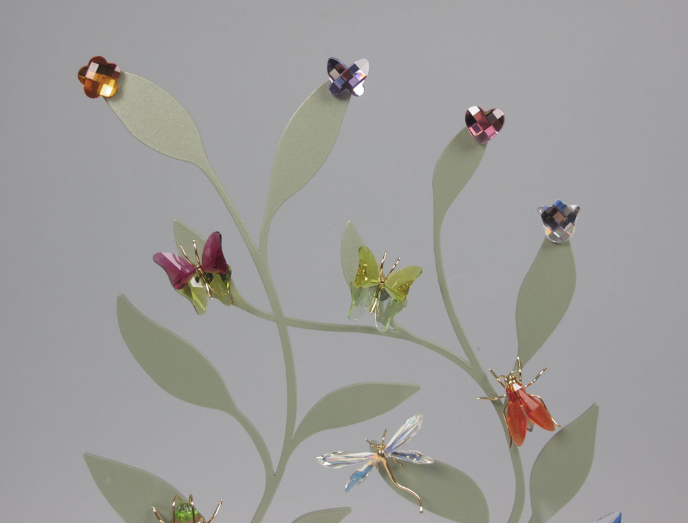 SWAROVSKI CRYSTAL INSECTS AND LARGE VINE DISPLAY: From the Daniel Swarovski Paradise collection 13 Crystal bugs, beetles and butterflies sold with large metal leafy display, approx. 21''h. and two green plastic Swarovski leaf displays. Also sold with 4 Swarovski magnetic shapes.