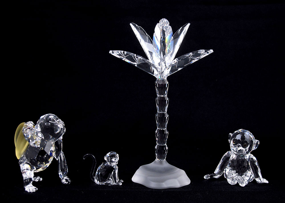 SWAROVSKI CRYSTAL FIGURES: 4 pieces to include, PALM TREE 7475, M. Stamey, issued 2004 retired 2007; CHIMPANZEE 7618, E. Mair, issued 1998 retired 2005; YOUNG GORILLA 7618, A. Stocker, issued 2001 retired 2007; ZODIAC MONKEY 7693, A. Hirzinger, issued 2002 retired 2007.
