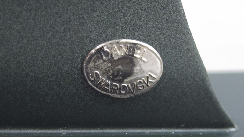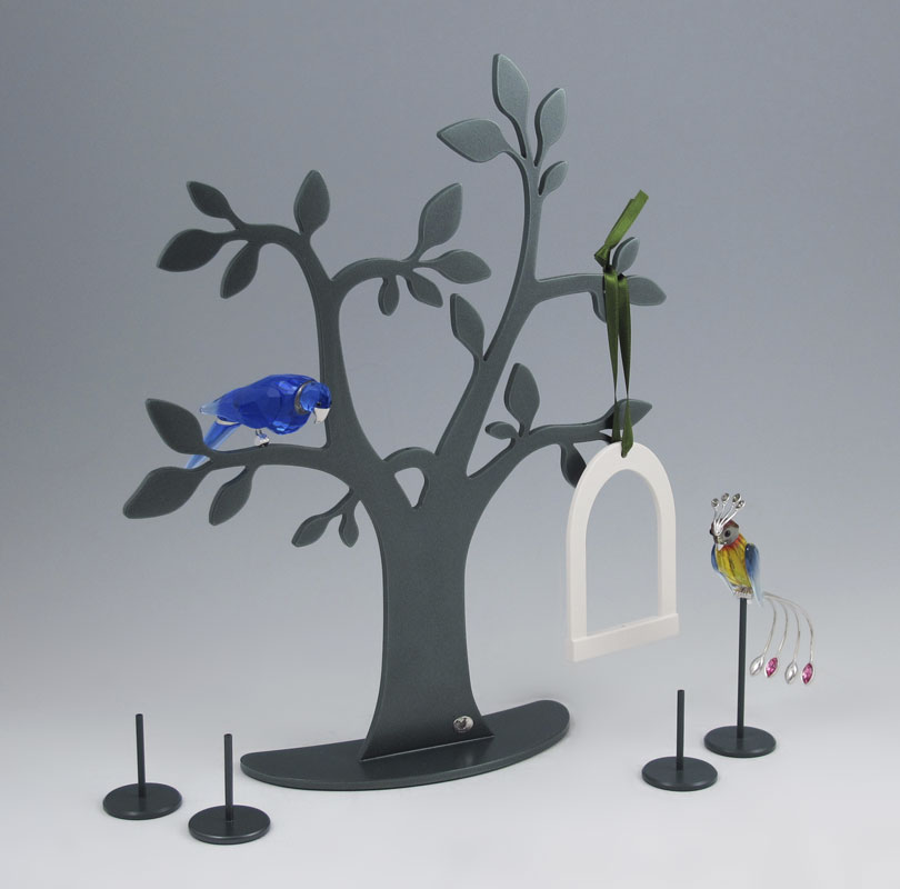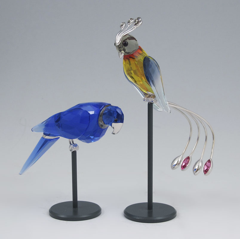 SWAROVSKI CRYSTAL FIGURES: 3 pieces to include, BANAMBA 284 064, fire opal bird of paradise, issued 2001 retired 2004, with stand; BALABAC 284 065, sapphire macaw, issued 2001 retired 2004, with stand; metal TREE DISPLAY, small, 11 7/8''h., ''swing'' and two additional stands.
