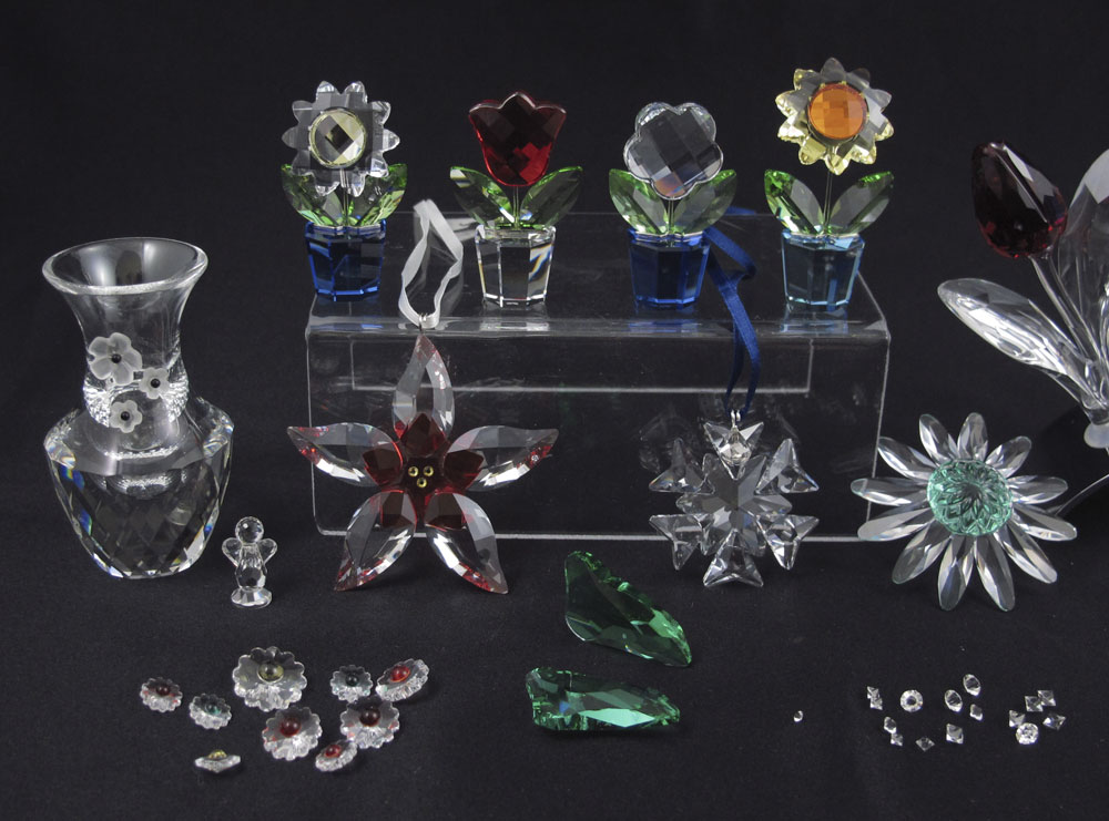 SWAROVSKI CRYSTAL FLOWERS: Tray lot to include, VASE 7511, team design, issued 1985 retired 1990; SCS yearly tulips with stand; four small flowers in pots, POINSETTIA Ornament; SNOWFLAKE Ornament; and assorted sparkles to include MARGUERITES.