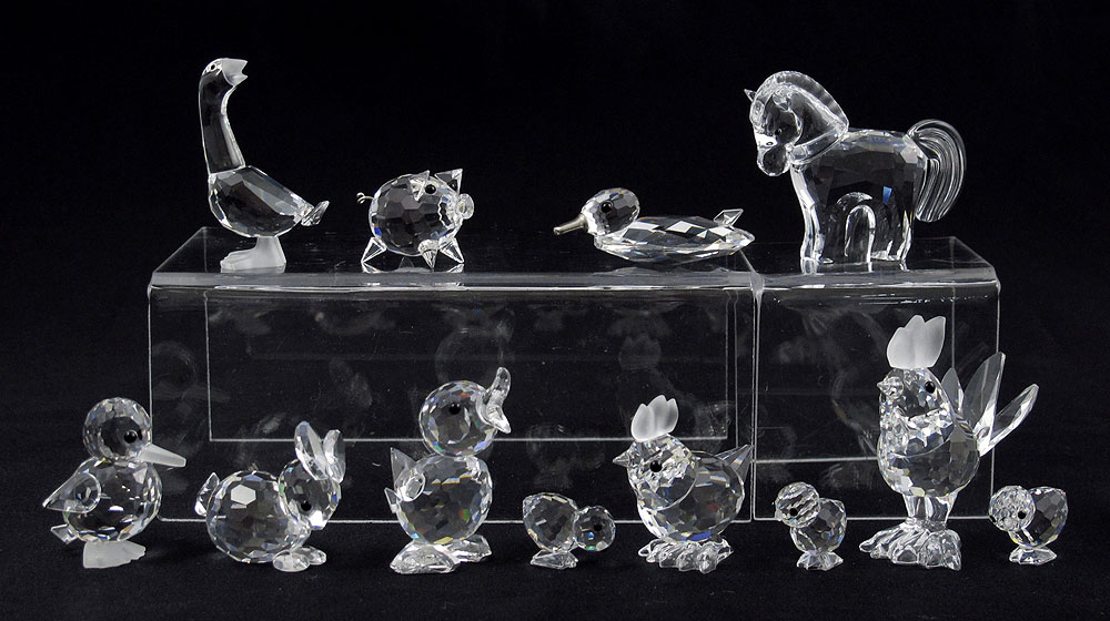 SWAROVSKI CRYSTAL FIGURES: 10 (12) pieces to include, Miniature PIG 7657, M. Schreck, issued 1982 retired 2009; Miniature HEN 7675, G. Stamey, issued 1987 retired 2000; Miniature COCKEREL 7674, G. Stamey, issued 1987 retired 2000; Set of 3 Miniature CHICKS 7676, G. Stamey, issued 1988 retired 2006; DICK GOSLING 7613, Adi Stocker, issued 1993 retired 1999; MINI DUCK 7653, Max Schreck, issued 1980 retired 1988; MINI LYING RABBIT 7678, Adi Stocker, issued 1988 retired 1995 Miniature DRAKE Standing 7660, M. Schreck, issued 1983 retired 2005; ZODIAC HORSE 7693, A. Hirzinger, issued 2002; and a little bird.